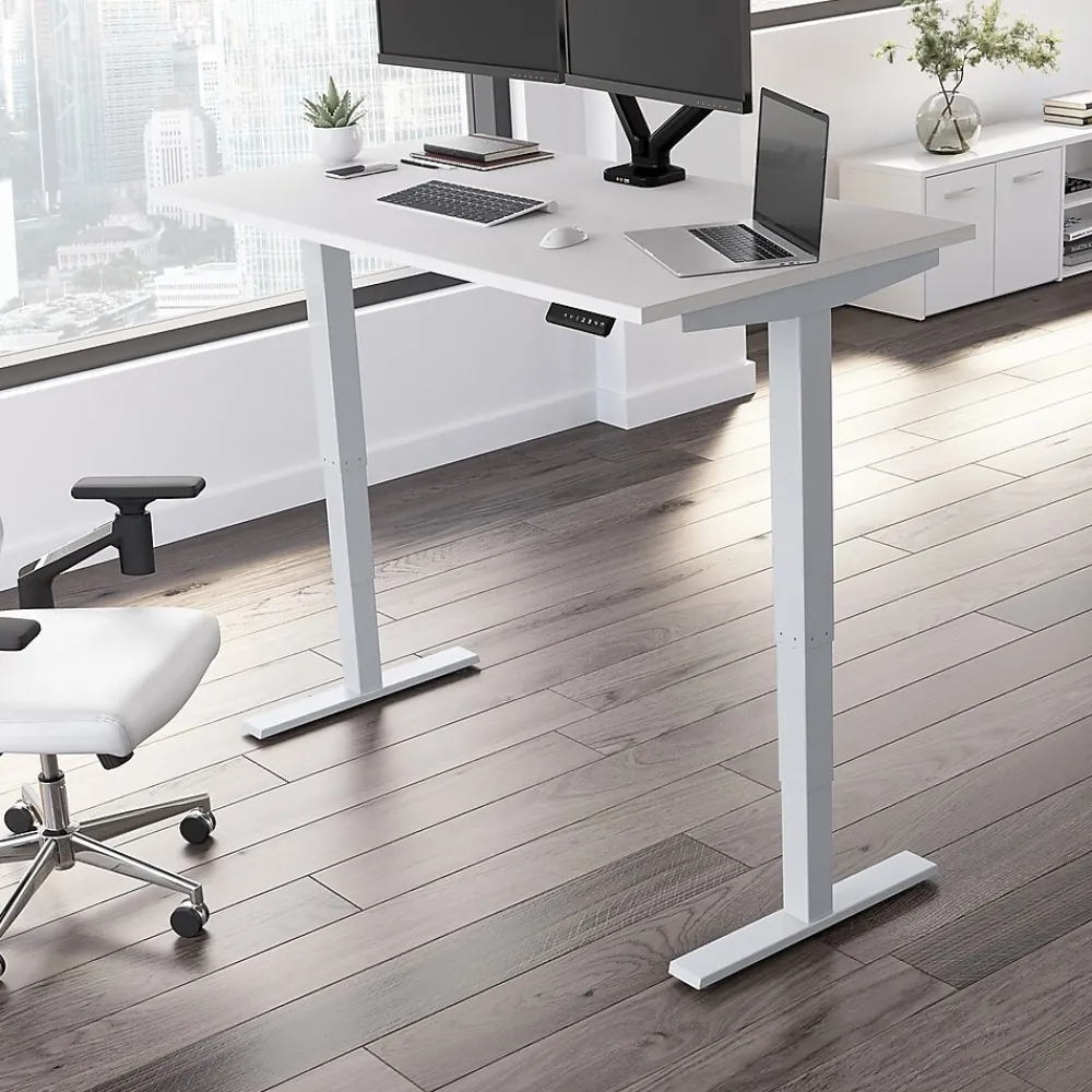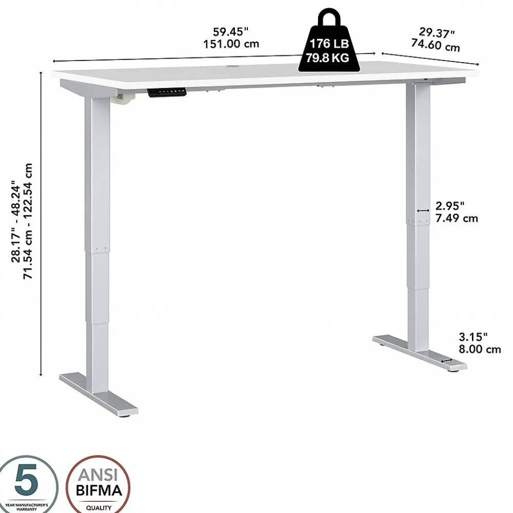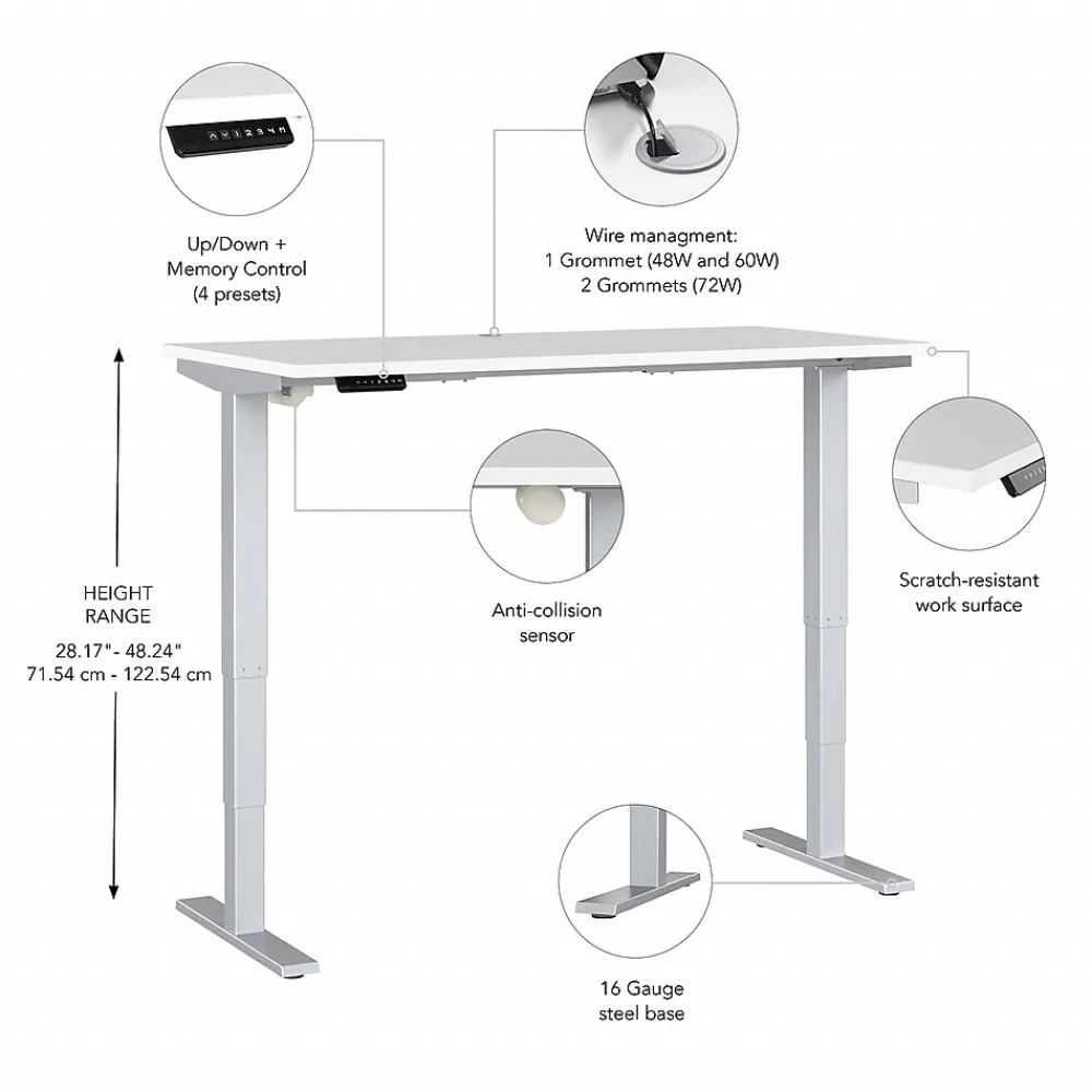 Bush Business Furniture’s Move 40 Series Electric Height Adjustable Standing Desk is a perfect way to build an ergonomic workspace without the high-end price tag. The 60W x 30D desktop lifts anywhere from 28 to 48 inches from the floor at a speed of 1.25 inches per second. The control panel includes four programmable presets that save your favorite heights so you can change positions without missing a beat. The Adjustable Desk also features an Anti-Collision Sensor that stops movement up or down if an object is detected. Built to endure the rigors of a busy professional environment, the thermally fused laminate work surface resists scratches and stains while a welded 16-gauge steel base allows the desktop to support up to 176 pounds. This Ergonomic Office Desk has been tested to meet or exceed ANSI/BIFMA standards for safety, durability and performance and is backed by a 5 Year Warranty.