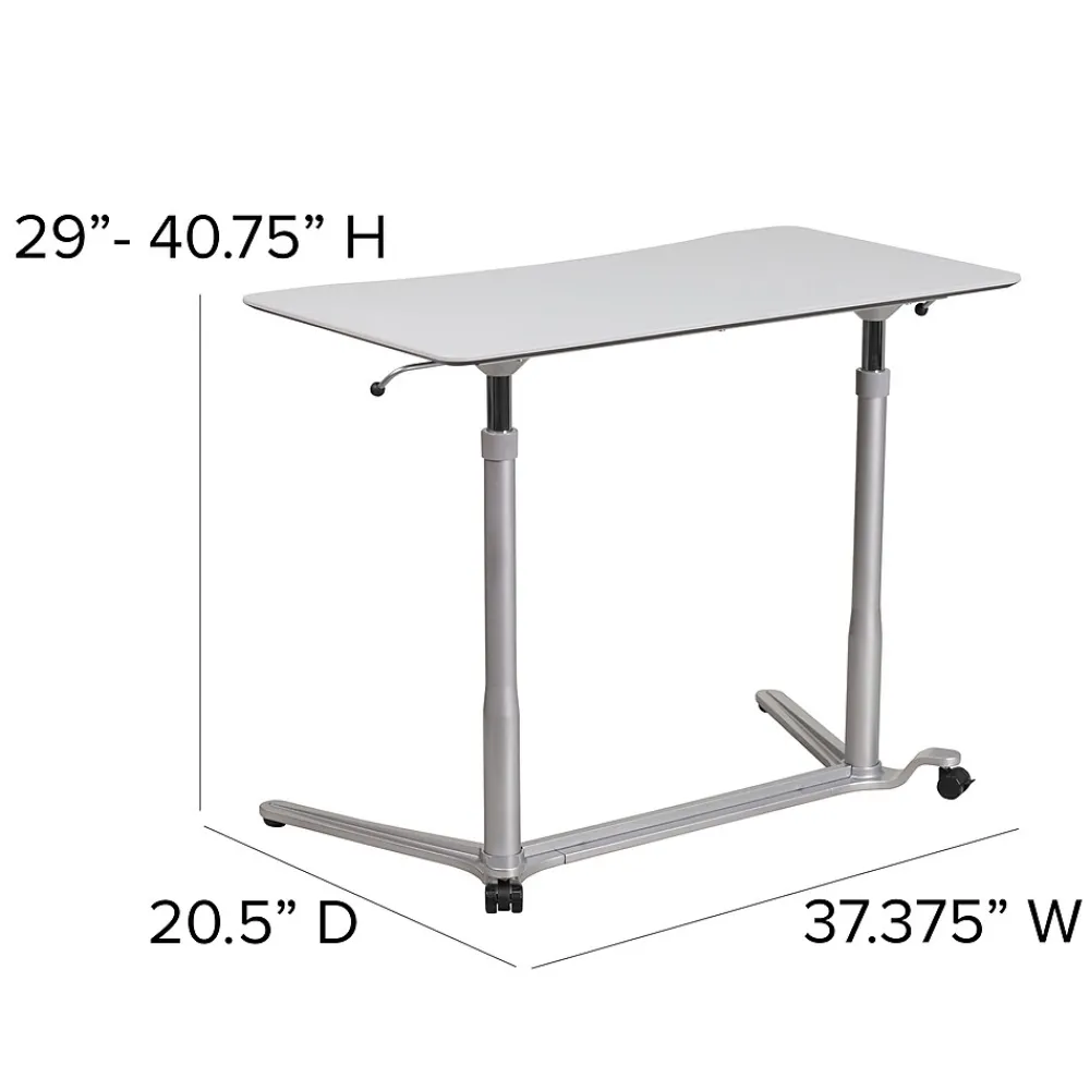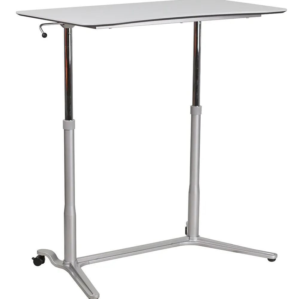 Achieve a healthier way of working with this contemporary, versatile computer desk. We all know that sitting for hours is an unhealthy practice, but with long workdays it has become more common. Standing helps strengthen leg muscles, improves your balance and promotes healthy blood flow. Standing even burns more calories than sitting. This ergonomic desk gives you the option to sit down or stand up. The pneumatic lever allows you to easily adjust the height with minimal effort. When preparing to work you should adjust the desk so the surface is at the most comfortable position for typing. The large surface make this desk suitable for laptop and desktop usage. Since desktops are heavier than laptops, front adjustable glides were added to the front of the desk, while locking glides are added to the back legs, making this desk essentially mobile.