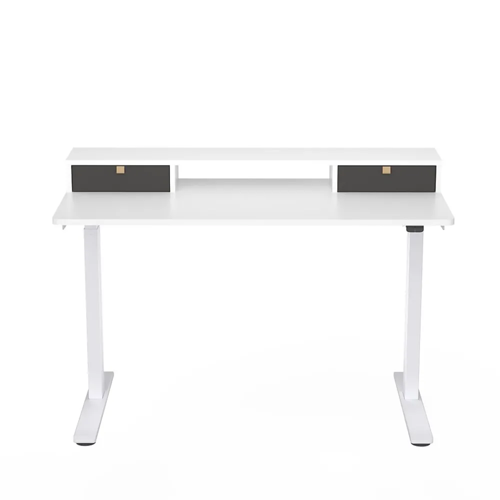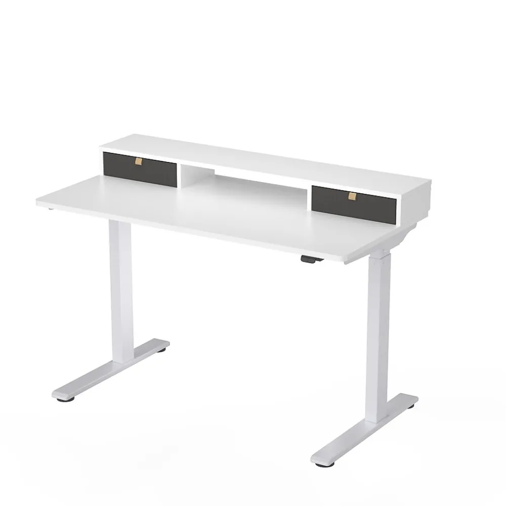 New to the series, the EC9WDO04W includes a shelf with 2 fabric storage drawers. The shelf system is not fixed to the table top, but has no-slip rubber feet which makes setup easy. The desk in this bundle is the EC9W which is a favorite for work from home or remote worker programs. It arrives partially assembled from the factory so it just requires a few steps to complete.