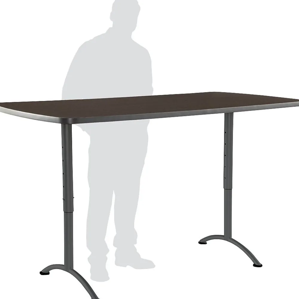 The ARC work table can be adjusted to accommodate more active work postures, like standing or leaning, while allowing the freedom to move around. This versatile work table is meant to be an all purpose table and flexible to the given work space. It can be used simply as a standard height desk to sit at, or you can easily adjust the height to use as a meeting or conference table. The surface is a beautiful Walnut finished melamine laminate top, and the legs are steel tubular with an arched base and adjustable levelers.