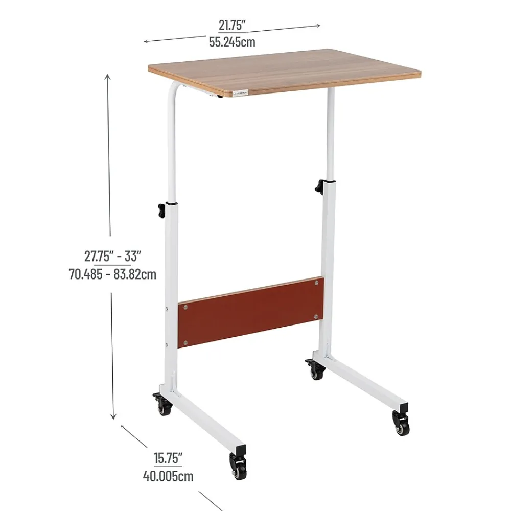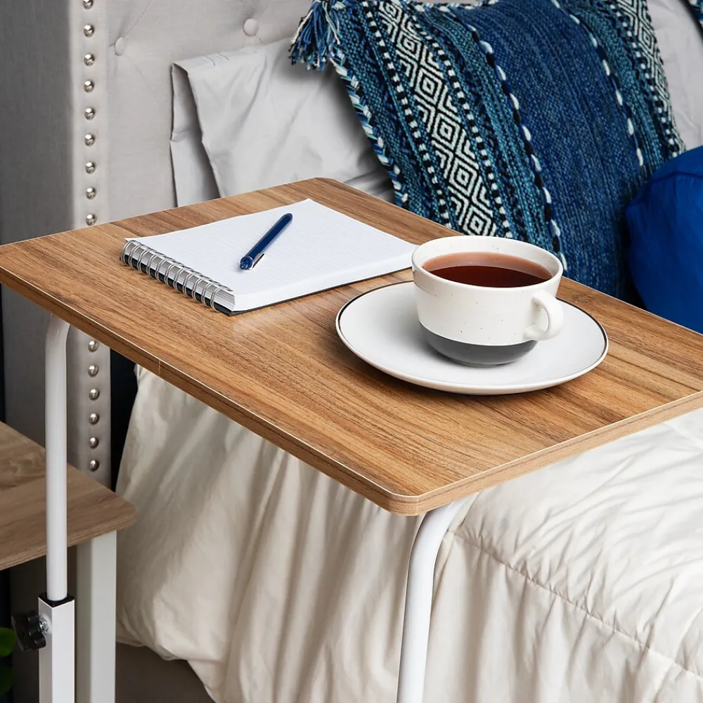 Elevate your workspace, working lunches and enhance your comfort with this over bed laptop desk. Say goodbye to awkward folding tables or hunching over low coffee tables, and welcome a sleek, convenient end table that easily pivots into a versatile surface for working, eating, or even reading. Its adjustable height levels make it perfect for use over the arm of a couch or over a bed.Designed to fit cozily alongside your couch, bed, or armchair, this unique desk features four wheels for easy maneuvering, and locking levers to keep it in place while you work or eat. The low-profile base fits seamlessly under a couch or bed frame, allowing you to adjust the table’s position for optimal comfort. The stable woodtone surface supports your laptop or plate, making work or dining a breeze.Upgrade your working or lunchtime experience with this adjustable height overbed desk, and enjoy comfortable, efficient working or dining anywhere in your home.