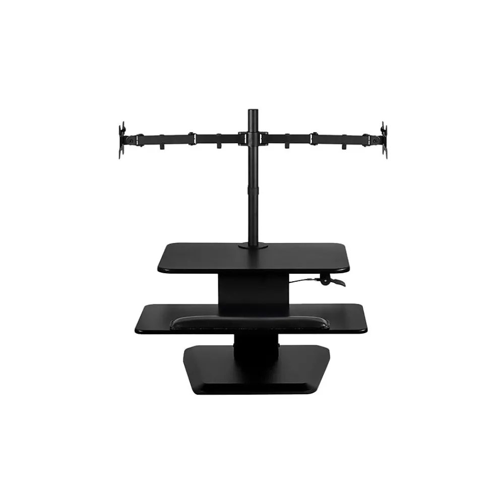 MI-7914 provides an easy and affordable way to stand while you work. This sit-stand desk converter sits on top of your existing desk and lets you work comfortably from either a sitting or ergonomic standing position. The spring-assisted lift mechanism allows you to raise and lower it in just seconds. The desktop platform and keyboard tray are sized adequately to support laptops, keyboard and mouse side by side. The included dual monitor mount increases productivity and frees up desk space.The full motion dual monitor mount can fit screens up to 27″, and the adjustable design lets you raise your monitors to a comfortable level. VESA head height can be adjusted up to 1” to perfectly align the height of your monitors.