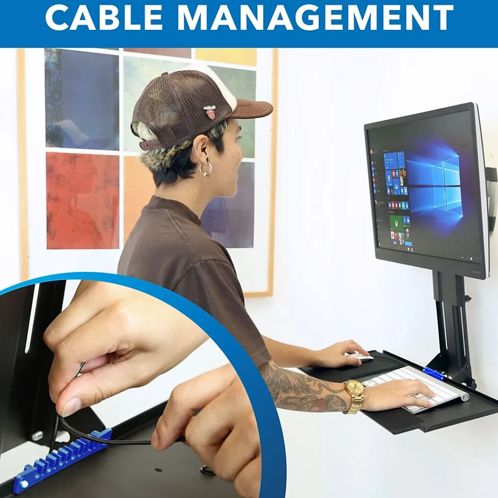- The 25″ floating platform tray is wide enough for your keyboard and a mouse, can tilt downward up to 25 degrees, and is height adjustable up to 5″.