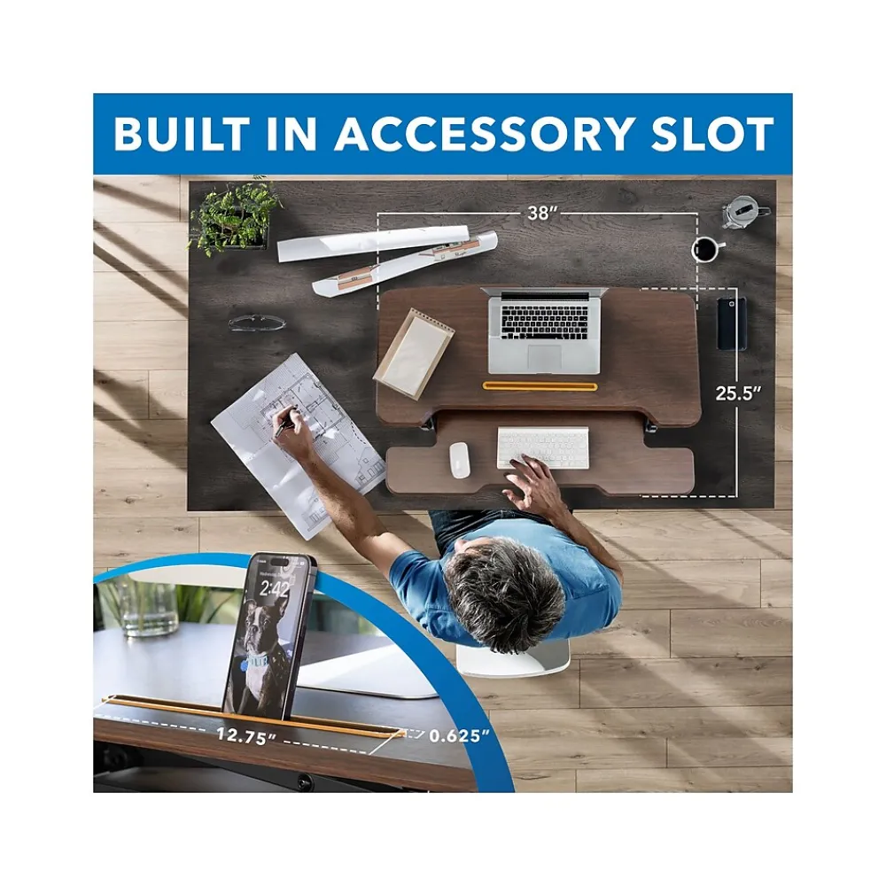 Add movement to your workday by converting your traditional desk or table into a dynamic sit-stand desk instantly. Alternating your position between sitting and standing throughout the day can help you work more healthy and increase productivity. Thanks to a built-in motor, this standing desk converter by Mount-It! can be easily adjusted to your preferred height at the touch of a button. The wide MDF platform with rounded edges allows you to place either one wide-screen monitor, two standard monitors, or a monitor and a laptop to create your perfect workspace. The lower keyboard platform is wide enough to hold a large keyboard with number pad, plus your mouse on a mouse pad. A built-in device channel holds your tablet or smartphone securely in place and even allows for routing your charging cable through the integrated slots. This Mount-It! electric desk converter is designed extra wide but less deep so that it can fit onto shallow desks and still provide you with a large workspace. The vertical scissor height adjustment raises the work surface straight up, which offers a space-saving benefit compared to conventional converters. Integrated rubber feet ensure your tabletop remains free from scratches.
