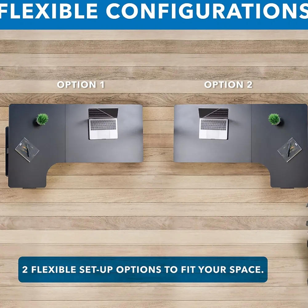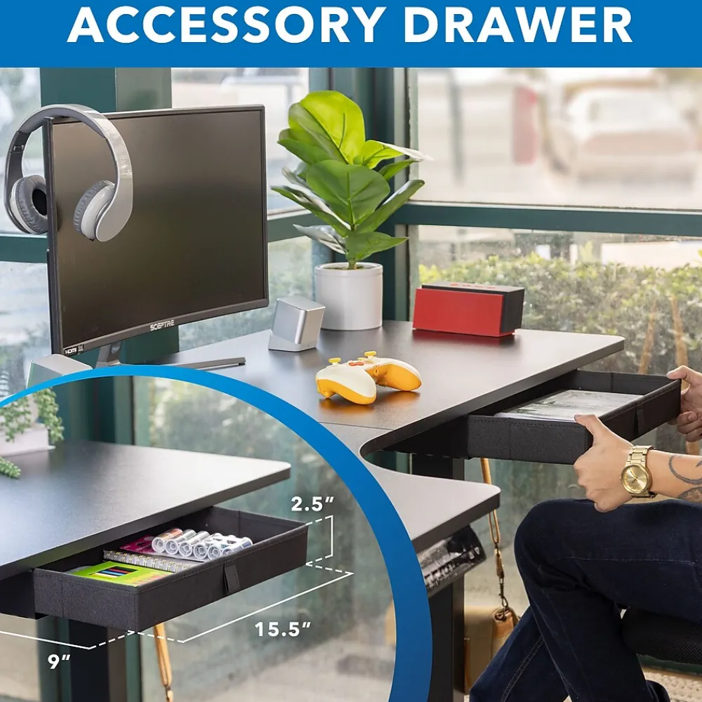 - SPACIOUS DESKTOP: Enjoy the benefits of an electric sit stand desk without compromising on desktop space. The two-piece desktop design allows for two flexible installation options with the table corner to be on either the left or right side to fit your space. Convenient space saving accessories include a cloth drawer, two hooks and cable management.