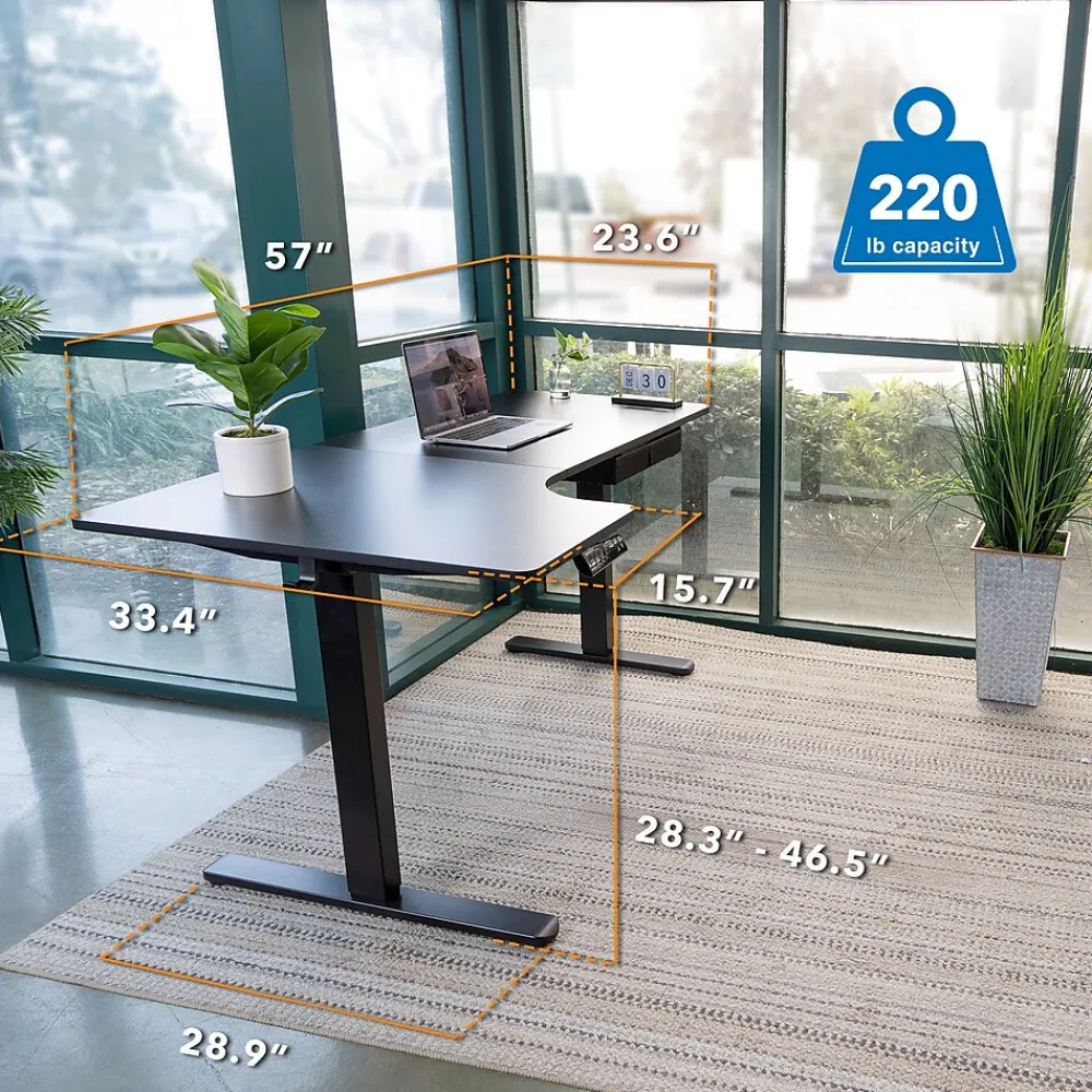 - A HEALTHIER WAY TO WORK: Feeling the pain from sitting all day at work? Add movement to your work day with this motorized standing desk in L-shape design. Feel more energized and boost productivity by frequently alternating between sitting and standing throughout the day in the office or when working from home.