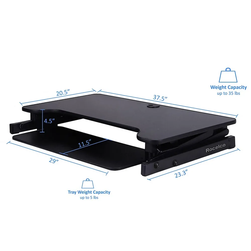 Enjoy the health benefits using this Deluxe Sit-to-Stand Adjustable Desk Riser, DADR. The desk top is extra large, 37.5″ x 20.5″, comfortably holding 2-3 monitors and a laptop. Easy to use handles on the side allows continuous height adjustment from 5″ up to 17″.A retractable keyboard tray offers the ergonomically correct position whether you’re sitting or standing.