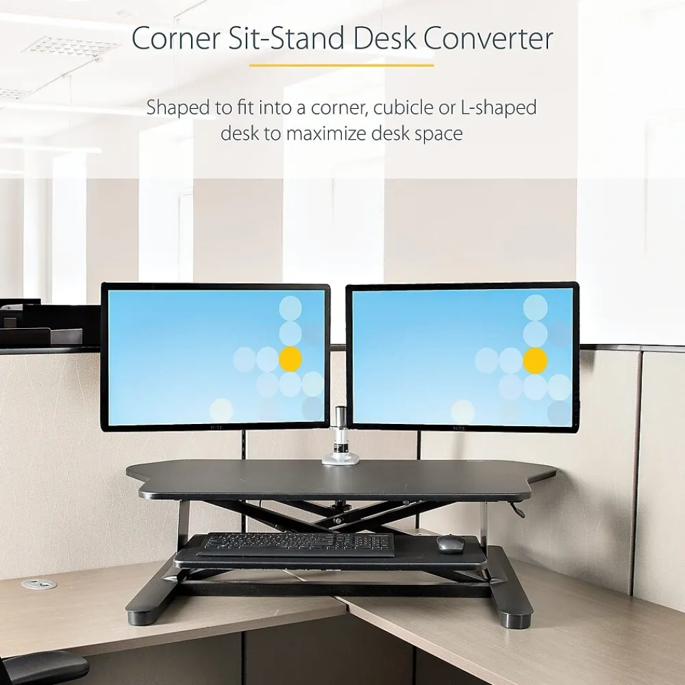 - Corner sit-stand desk converter with smooth adjustable height between 6.1-23″ from desk’s surface