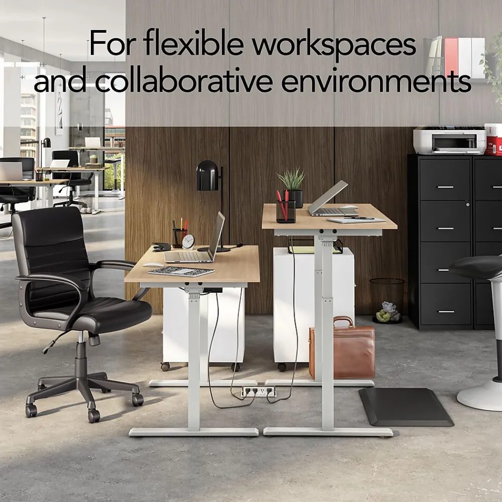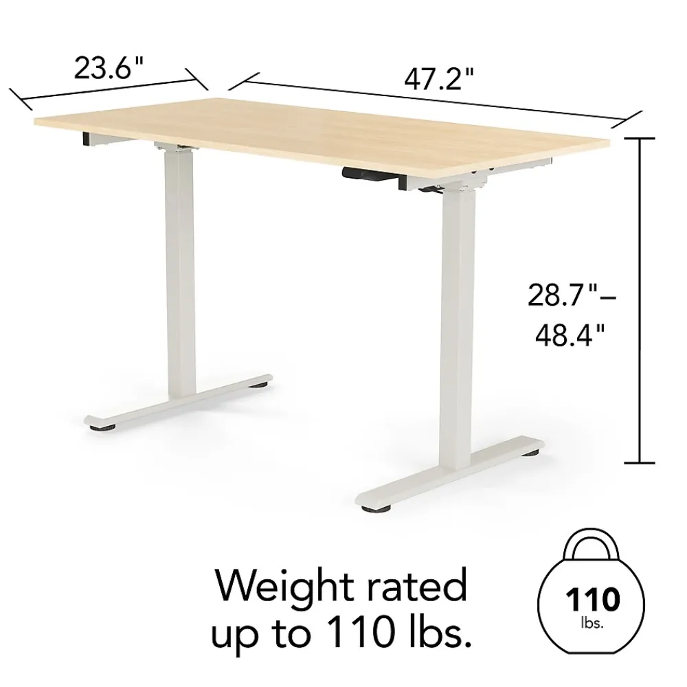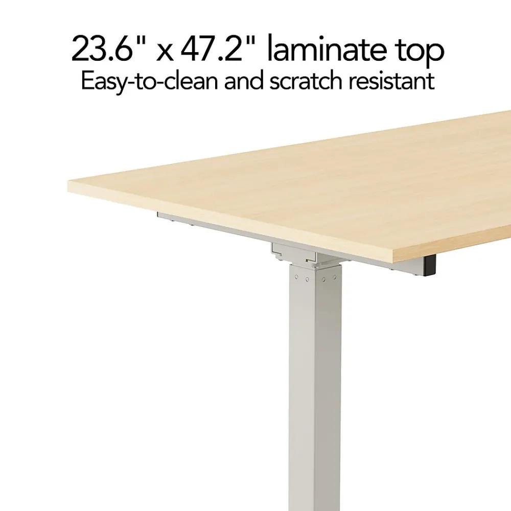 Alternate between standing and sitting for increased comfort with this 48″W desk. The single-motor lift system and intuitive two-button controls let you quickly adjust the desktop height from 29″ to 48″, and the two-stage column base provides stability without sacrificing legroom. Made with particleboard, the desktop offers lasting durability. This Union & Scale Essentials 48″W height-adjustable desk features a tabletop with a natural finish and gray metal legs to give your work area a sleek, modern appearance.