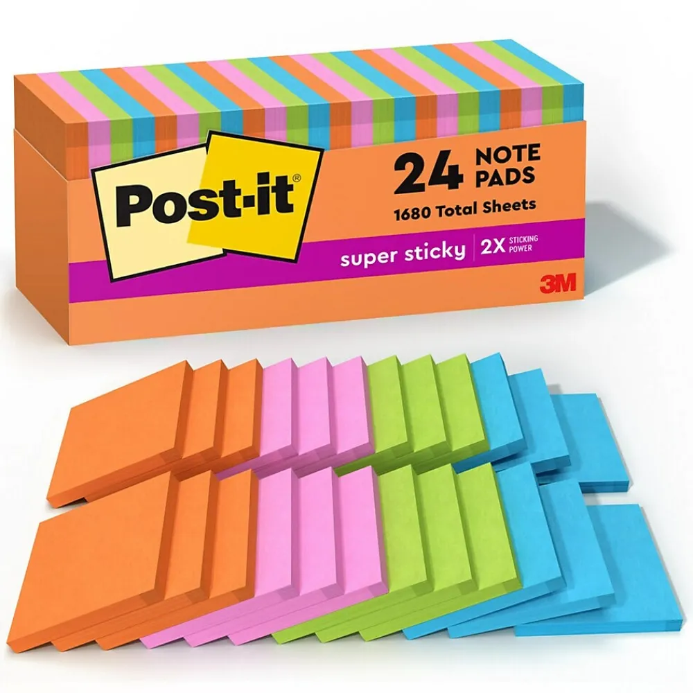 Uplift your spirits and messages via the vibrant, strong colors of the Energy Boost collection. Whether jotting down your daily to-do’s, brainstorming big ideas, studying or setting reminders, colors and ideas are always brighter together. These sticky notes feature 2X the sticking power. They also stick and re-stick – allowing you to move your notes with you throughout your day. They’re ideal for walls, doors, windows and other vertical surfaces, and like all Post-it Notes, they stick securely yet remove cleanly without damage. Keep your ideas across your notebooks, classroom books, calendars or other documents. No tape or tacks are needed with adhesive notes, saving you money and time on office products or school supplies. A great memo pad, these are ideal for using for notes or reminders to yourself or others. Post-it Super Sticky Notes are the perfect solution for shopping lists, reminders, notes on computer screens, time tracking, to-do lists, marking cables, color-coding documents, reminding kids to do chores, storyboarding, scratch paper and agile processing. Each notes sheet is approximately 3 in. x 3 in., with 90 sheets per pad and 24 sticky note pads per pack. These colorful sticky notes include colors from the Energy Boost collection including orange, pink, yellow, blue and green. All Post-it Notes are sourced from certified, renewable and responsibly managed forests, and all Post-it Notes are recyclable, so you can recycle them when they are no longer needed.