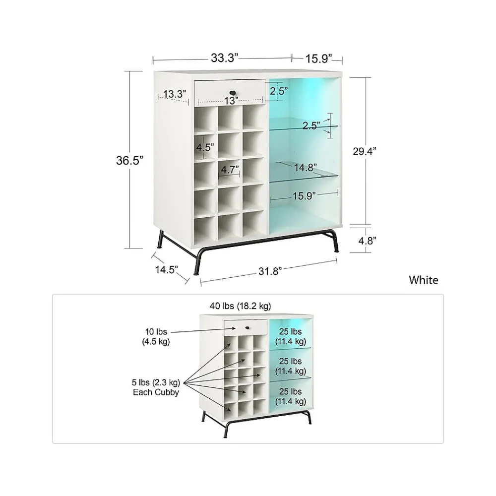 Step away from the ordinary and give your entertainment space a modern makeover with the Ameriwood Melbourne bar cabinet. This beverage cabinet features LED lighting with seven different color settings for a fun and funky look for your entertainment space. But the modern touches don’t stop there. The three open shelves (two glass) can organize glasses, tumblers, and mixers, so you have everything you need to get the party started. The 15 open bottle cubbies will offer plenty of space to organize your wine and liquor bottles. The drawer is perfect for storing away utensils, napkins, and other party supplies. This cabinet features a mix of white laminated particleboard and MDF with metal feet and tempered glass shelving. The cabinet ships flat to your door and requires assembly upon opening. Two adults are recommended to assemble.