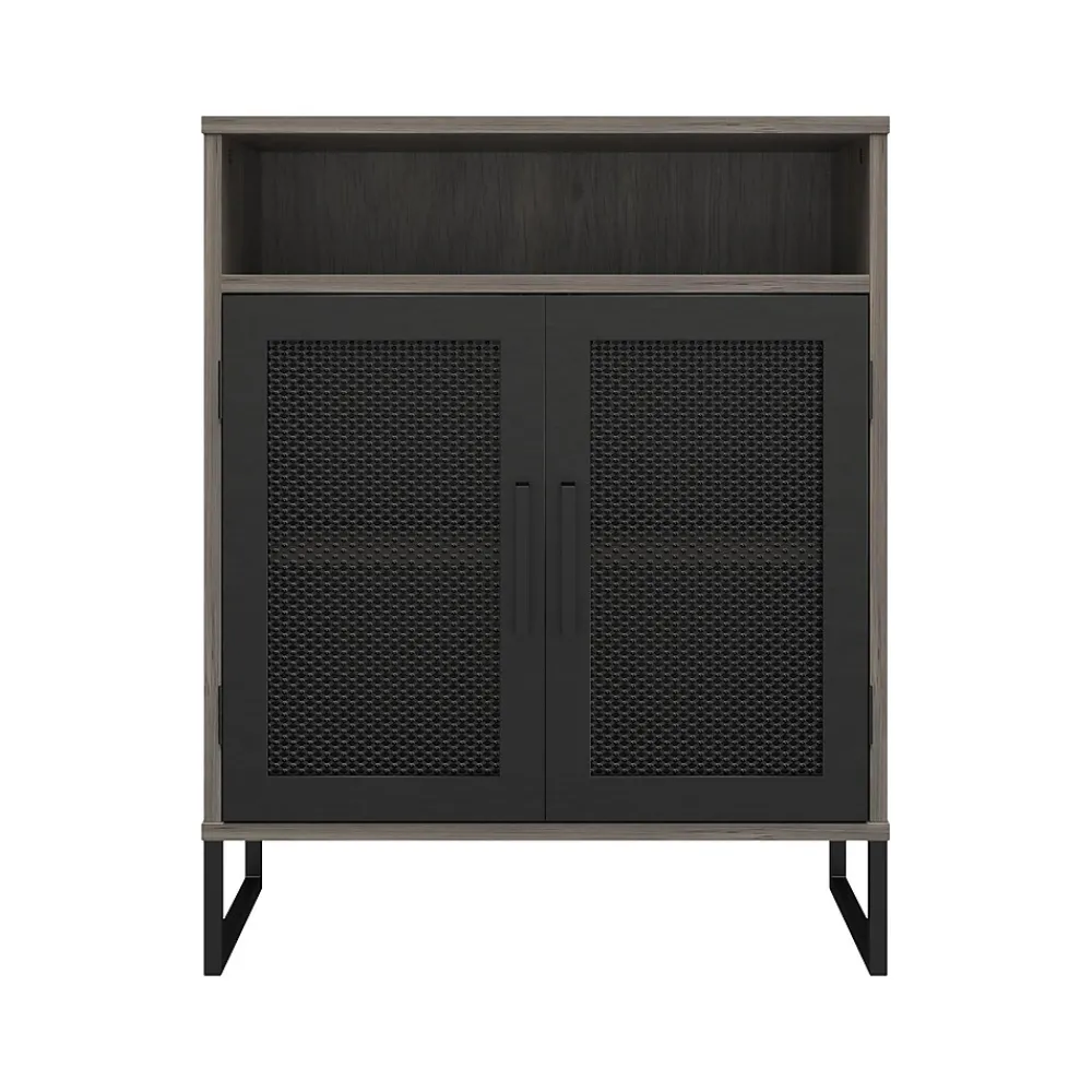 - Made of durable laminated MDF and particleboard in a gray oak finish with sturdy black powder-coated metal with stylish mesh front doors