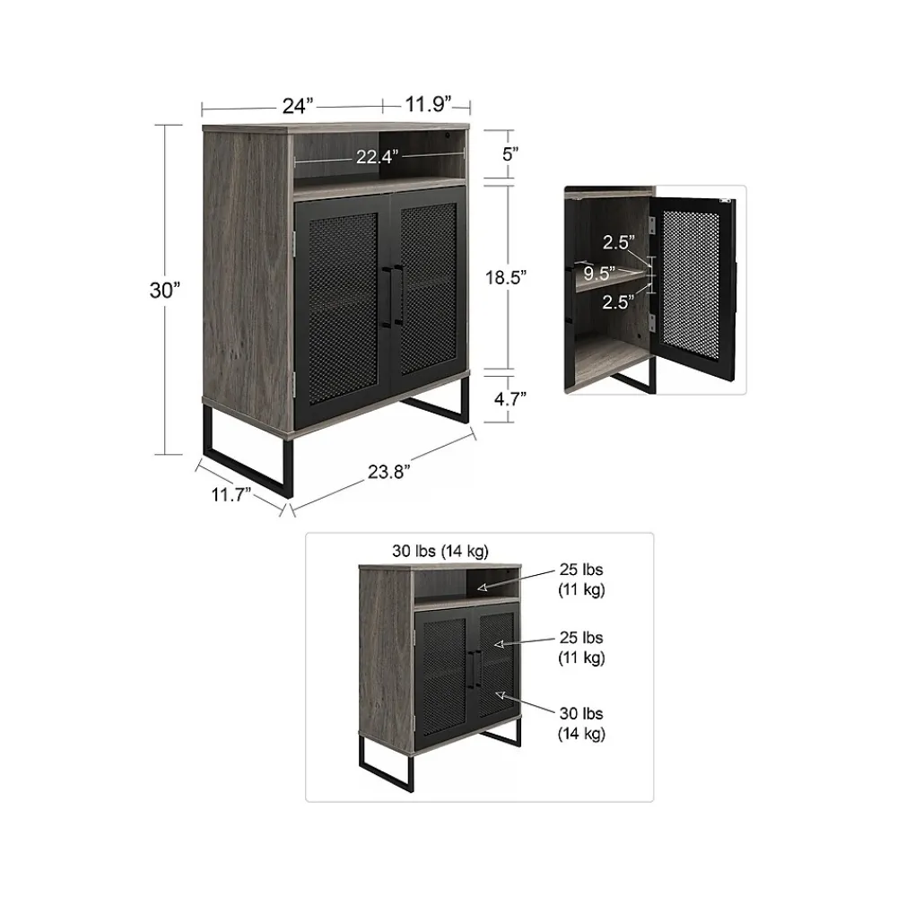 Streamline and organize your home office or dorm room with the Ameriwood Purdue storage cabinet. Made of durable laminated MDF, particleboard, and sturdy powder-coated metal, the gray oak finish and black metal legs give your space a modern upgrade you crave, at an affordable cost you can stomach. The Purdue storage cabinet, with its two doors and three shelves, makes a great addition to your work or study space, but its style and crisp design make for a perfect solution in any room where extra storage is desired. An open cubby just below the top is perfect for storing extra printer paper, pens or notepads, and the two spacious shelves below allow you to tuck away essentials out of sight to keep your home looking neat and clutter-free. The metal mesh cabinet doors are carefully crafted with a magnetic catch for a smooth and secure close every time. The top shelf behind the cabinet doors can be adjusted or removed for exceptionally tall to exceptionally small item storage.