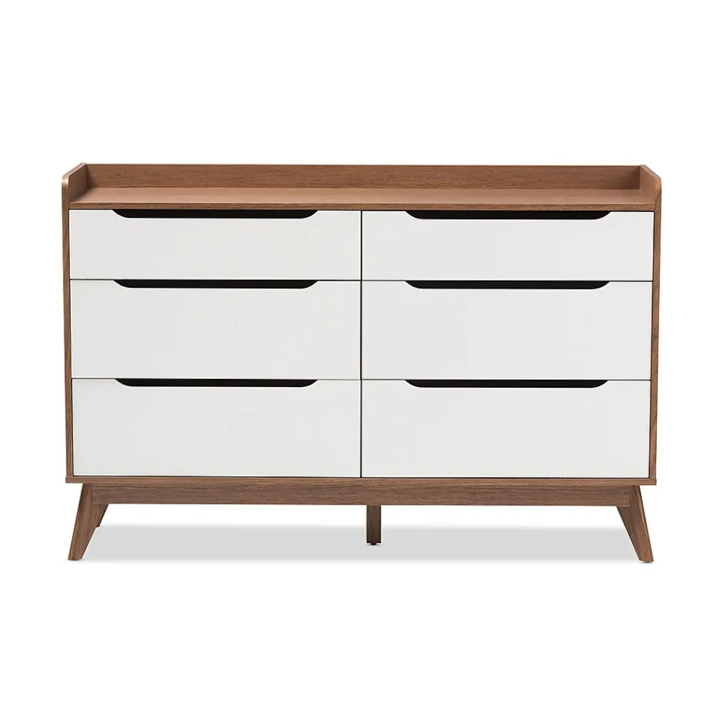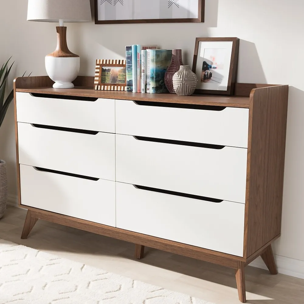 Featuring clean lines and extensive storage space, the Baxton Studio Brighton 37″ High 6-Drawer Chest is a sleek and functional addition to the bedroom. The Brighton is constructed from MDF wood in a walnut and white veneer finish. Six drawers provide space for storing linens, clothes, and more. Cut-out handles and runners provide easy access to the drawers. Inspired by mid-century modern design, the chest showcases splayed legs. The Brighton chest is made in Malaysia and requires assembly.