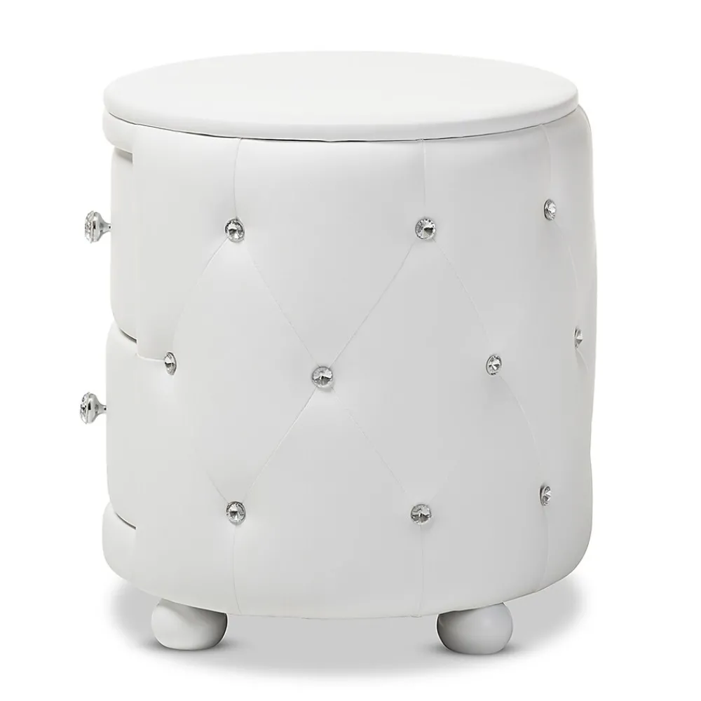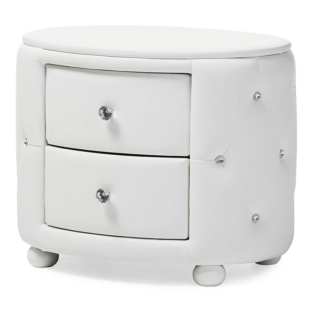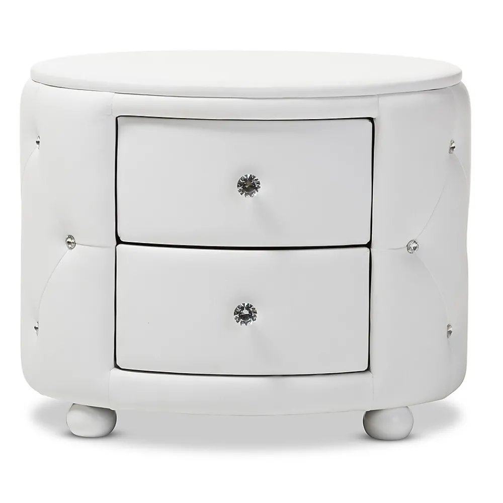 Inspired by Hollywood glamour modern design, the Davina nightstand is an icon of modernization. Constructed of solid rubberwood and plywood, this oval-shaped bed side table is fully upholstered in white faux leather for a smooth surface with a matching MDF top. Faux crystal buttons are tufted throughout to create a blink-blink visual effect. Marry style and function with this beautiful bedside table. With two spacious drawers, this will help organizing your bedroom accessories. Faux crystal knobs and the matching wooden legs will instantly attract all of your guests’ attentions. Made in Malaysia, the nightstand will arrive fully assembled.