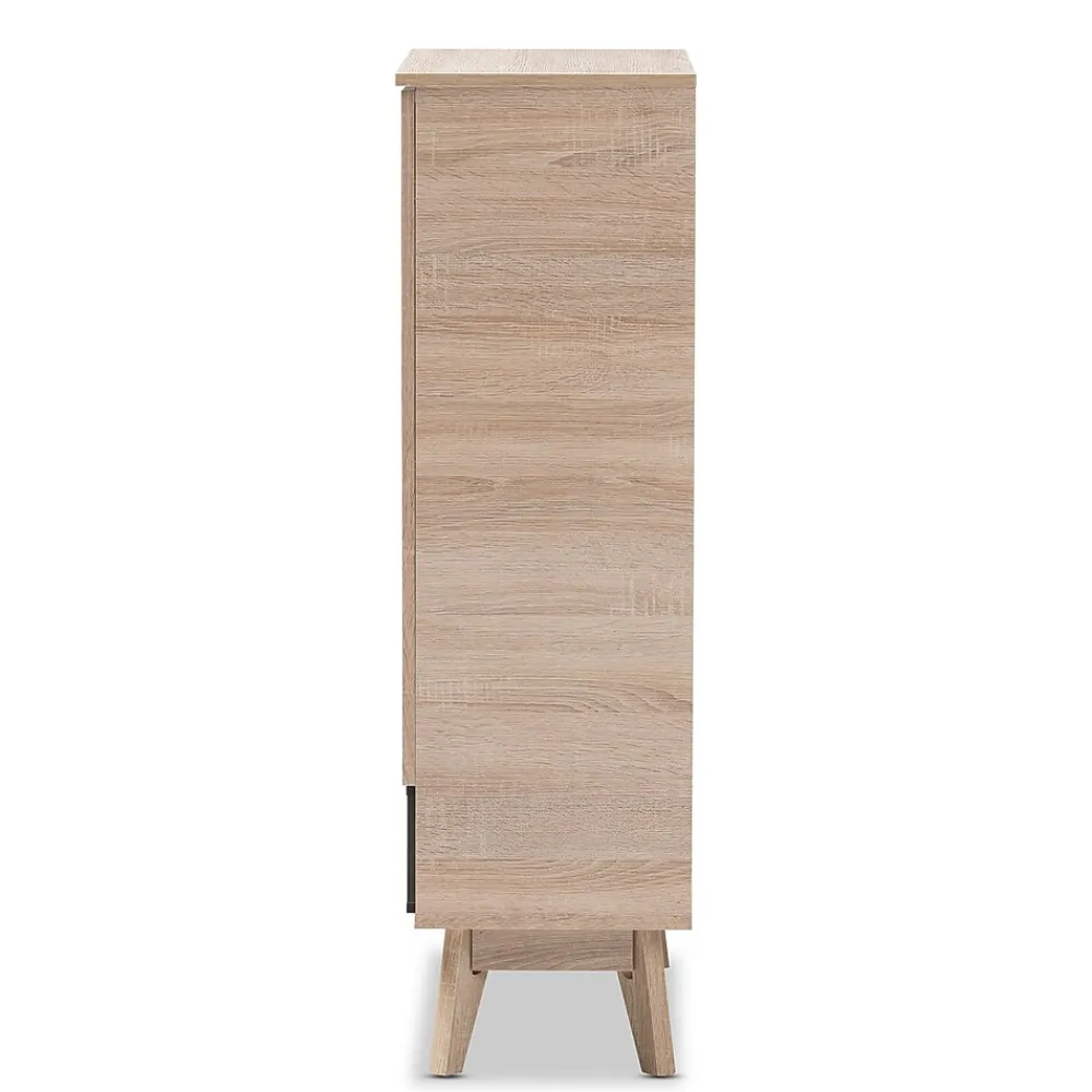 The solution to stylish and functional shoe storage lies within the Baxton Studio Fella 46″ High Shoe Cabinet. The Fella is constructed from durable MDF wood in an oak and gray finish. Two doors conceal five shelves with space to store sneakers, heels, and more. An open shelf below the doors provides additional storage space. Inset handles grant easy access. Inspired by mid-century modern design, the cabinet showcases splayed legs. The Fella shoe cabinet is made in Malaysia and requires assembly.