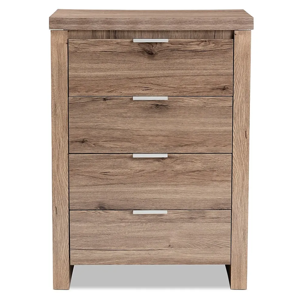 The Laverne 4-drawer chest is an essential piece of furniture that is both charming and simple. The modern and contemporary-inspired design is exemplified in the rectangular, geometric silhouette. The Laverne is finished in a natural oak brown to give you a hint of rustic and natural vibes. The chest features convenient top side drawer pulls on each of the four drawers, which roll out smoothly on slides. The minimalist chest, with its neutral coloring, will be easy to coordinate with the decor in your bedroom or guest room. The Laverne can even serve as additional storage in your entryway, living room, or closet. Made in Malaysia, the chest requires assembly.