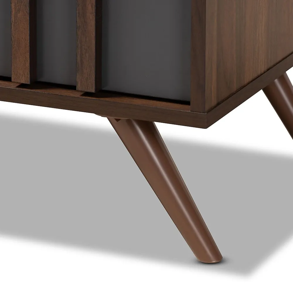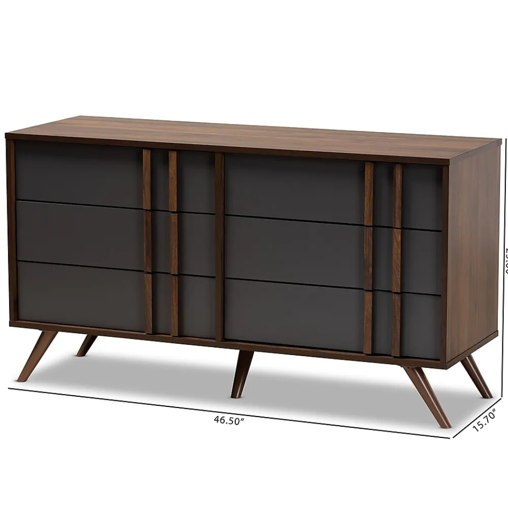 With an ultra-modern, two-tone finish and ample storage space, the Naoki dresser is sure to make an impression in any space. Made in Malaysia, this wood dresser features five spacious drawers to store clothes, linens, and more. Each drawer is fitted with metal glides for smooth movement. A two-tone grey and walnut finish are paired with long, double vertical handles for a cool, contemporary look. Requiring assembly, the Naoki dresser is supported by splayed legs that create a chic, retro profile.