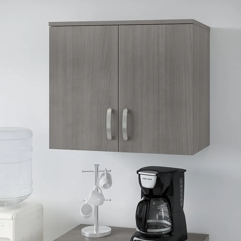 The Bush Business Furniture Universal wall cabinet with doors and shelves features a commercial-quality design and contemporary styling that suits virtually any home or professional environment. Organize your office, break room, garage, laundry room, or any other work or living space with a wall-mounted cabinet that’s built to last and boasts plenty of practical storage capacity. Cabinet doors with smooth Euro-style hinges open to reveal one fixed shelf and one adjustable shelf that accommodate office supplies, tools, and household items of various sizes. The total weight capacity of the small wall shelf is 30 lbs. For best use, mount wall studs 16″ apart during installation. This wall storage cabinet has been tested to meet ANSI/BIFMA standards for safety and performance and is backed by a 10-year warranty. Complete your space with Universal full line of modular storage solutions.