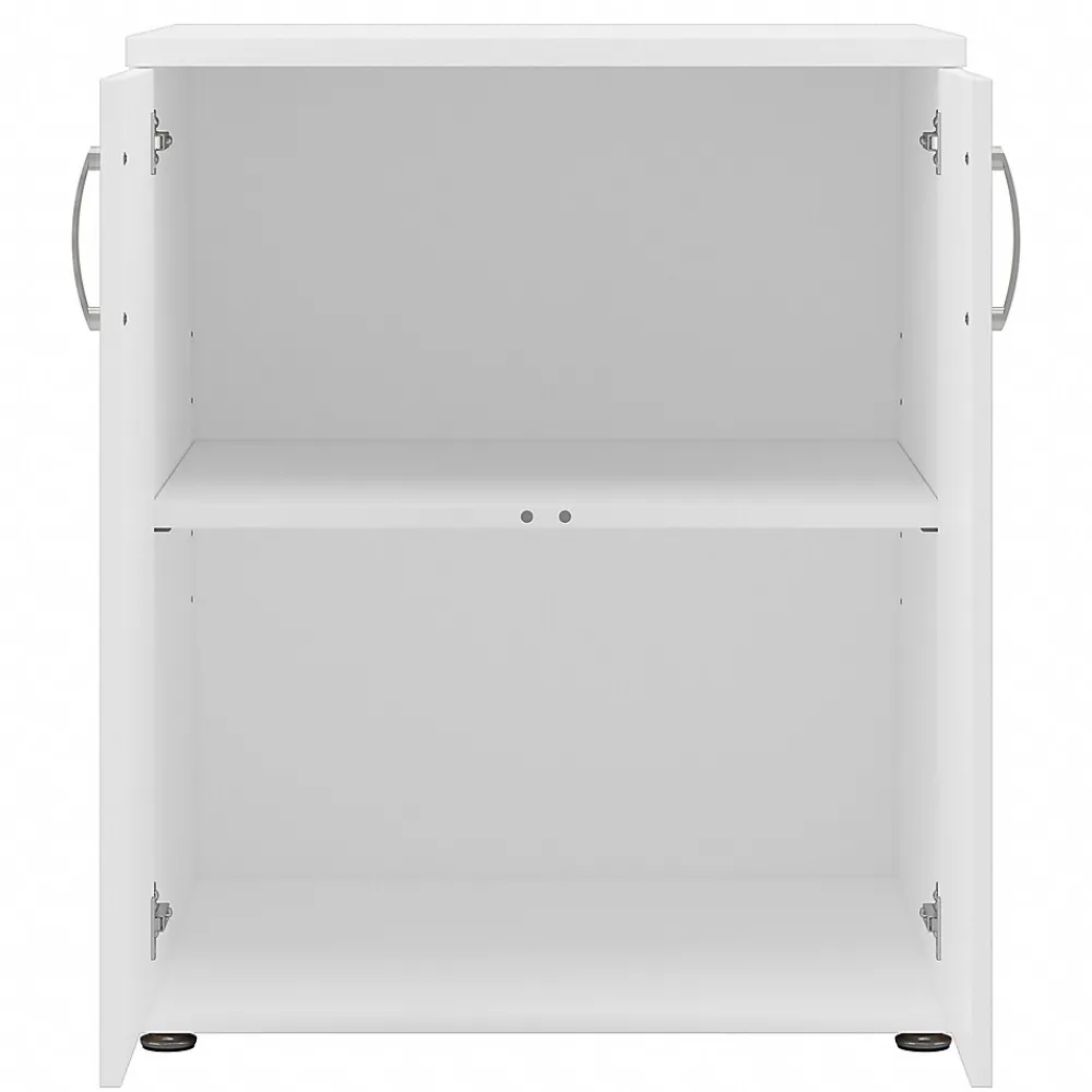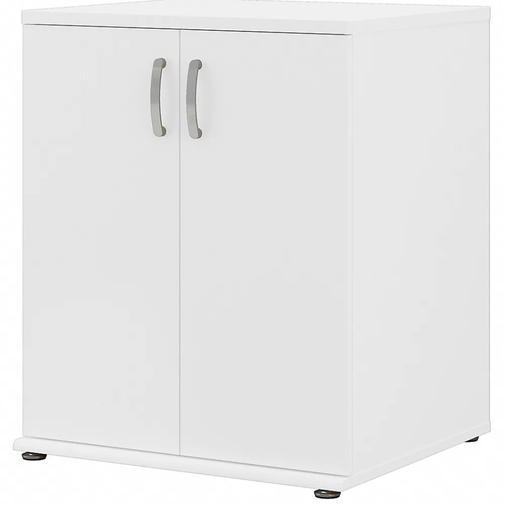 The Bush Business Furniture Universal floor storage cabinet with doors and shelves features a commercial quality design and contemporary styling that suits virtually any home or professional environment. Organize your office, break room, garage, laundry room, or another work or living space with an accent cabinet that’s built to last and boasts plenty of practical storage capacity. Cabinet doors with smooth Euro-style hinges open to reveal one fixed shelf and one adjustable shelf that accommodate office supplies, books, tools, and household items of various sizes. Each shelf supports up to 50 lbs., so storing larger materials is no problem. The floor cabinet’s base includes adjustable levelers to compensate for uneven surfaces. This two-door storage cabinet has been tested to meet ANSI/BIFMA quality standards for safety and performance and is backed by a 10-year manufacturer warranty.