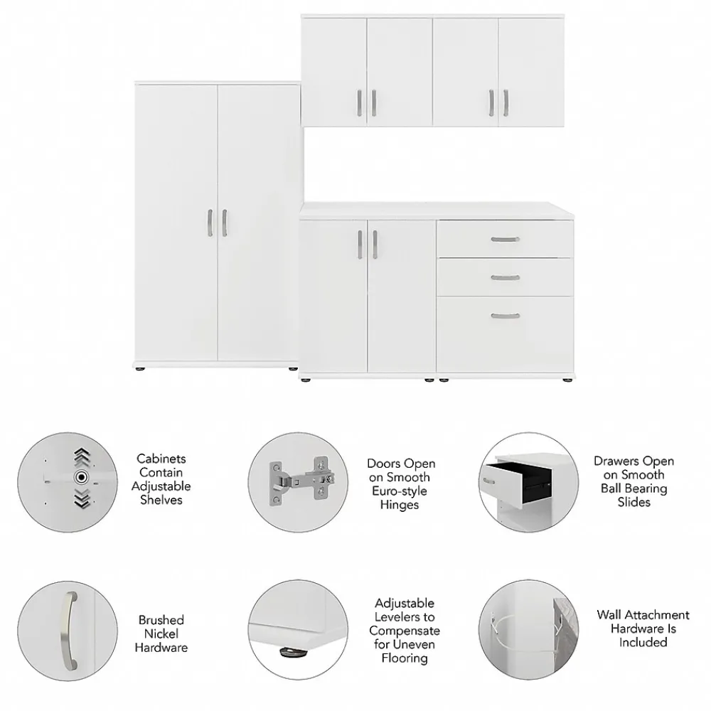 - Bundle includes: tall storage cabinet with doors, floor storage cabinet with doors, floor storage cabinet with drawers, and two wall cabinets with doors