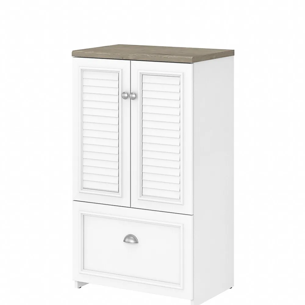 The Bush Furniture Fairview two-door storage cabinet with file drawer is a great way to organize any home office or living space while invoking the cozy, welcoming charm of modern farmhouse styling. Slightly weathered finish pairs with antique pewter hardware to create a casual appearance and durable construction promises to withstand years of regular use. This versatile accent cabinet features stylish louvered doors that conceal three shelves, two of which can be adjusted to store items of various sizes. The file drawer opens on full-extension ball-bearing slides for an effortless reach to letter-, legal-, and A4-size paperwork. The back panel has punched-out holes for wire management and ventilation, making it an ideal choice for storing your laptop and other devices. This farmhouse cabinet is tested to meet ANSI/SOHO standards for safety and performance and is backed by a 6-year warranty.