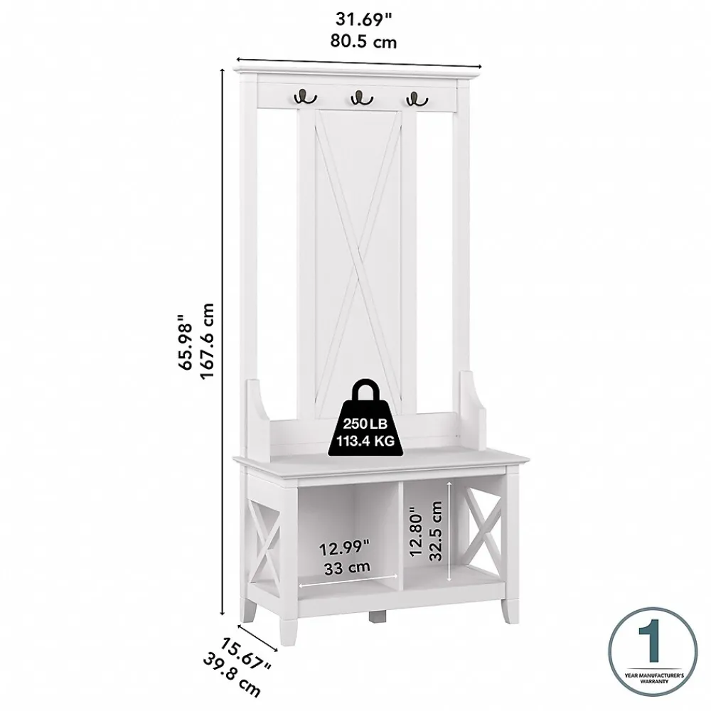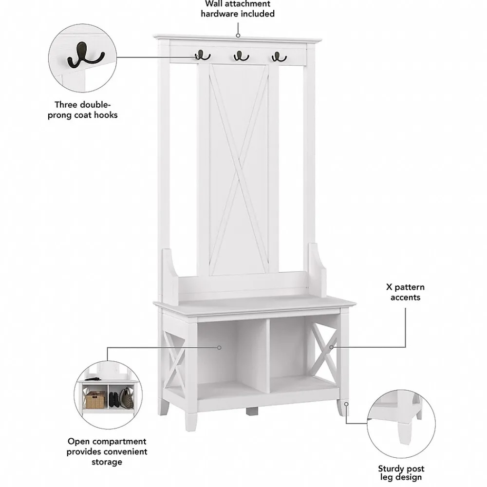 The Bush Furniture Key West hall tree with shoe storage bench offers an entryway solution that gives your home a touch of casual style. This entryway organizer has space for shoes, outerwear, and accessories, so they’re right where you need them when it’s time to go. The hall tree includes three double-prong coat hooks for hanging jackets, hats, scarves, and more. The shoe bench supports up to 250 lbs., so you can take a seat while putting on or removing footwear. Stash your sneakers, boots, and other shoes inside the open compartment underneath the storage bench to maintain a clutter-free mudroom. X-shaped accents convey a casual appearance that works well with cottage, coastal, and modern farmhouse style. This entryway bench and hall tree set has been rigorously tested to meet Bush Furniture standards for safety, durability, and performance and is backed by a 1-year warranty.