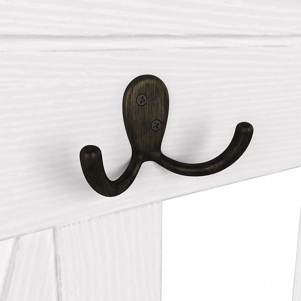 - Hall tree with shoe storage bench has three double-prong coat hooks for hanging jackets, hats, scarves, and more
