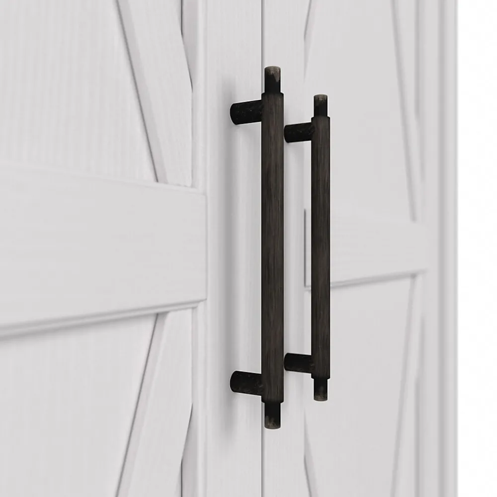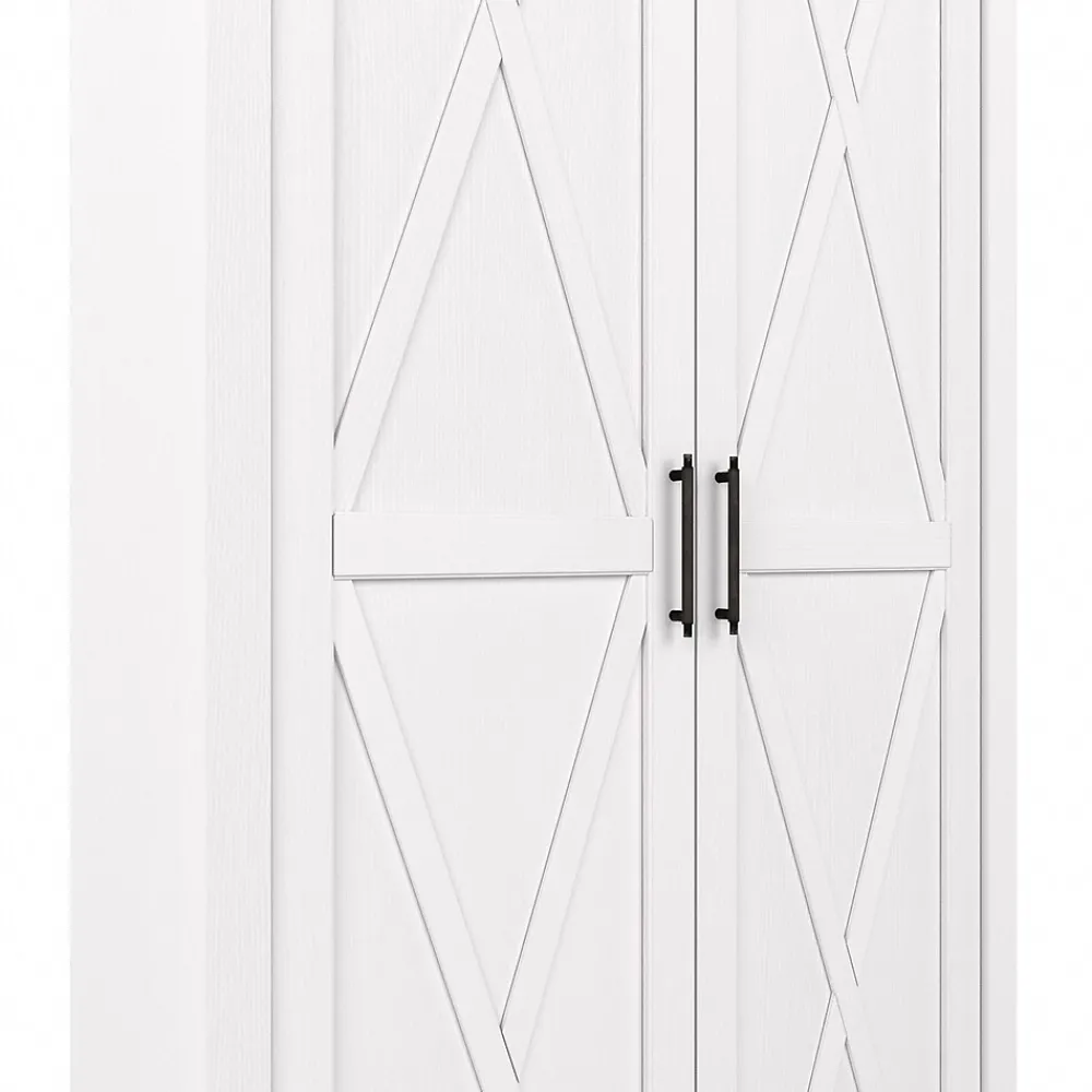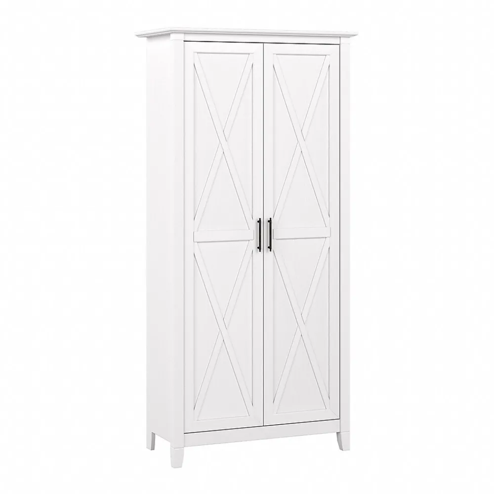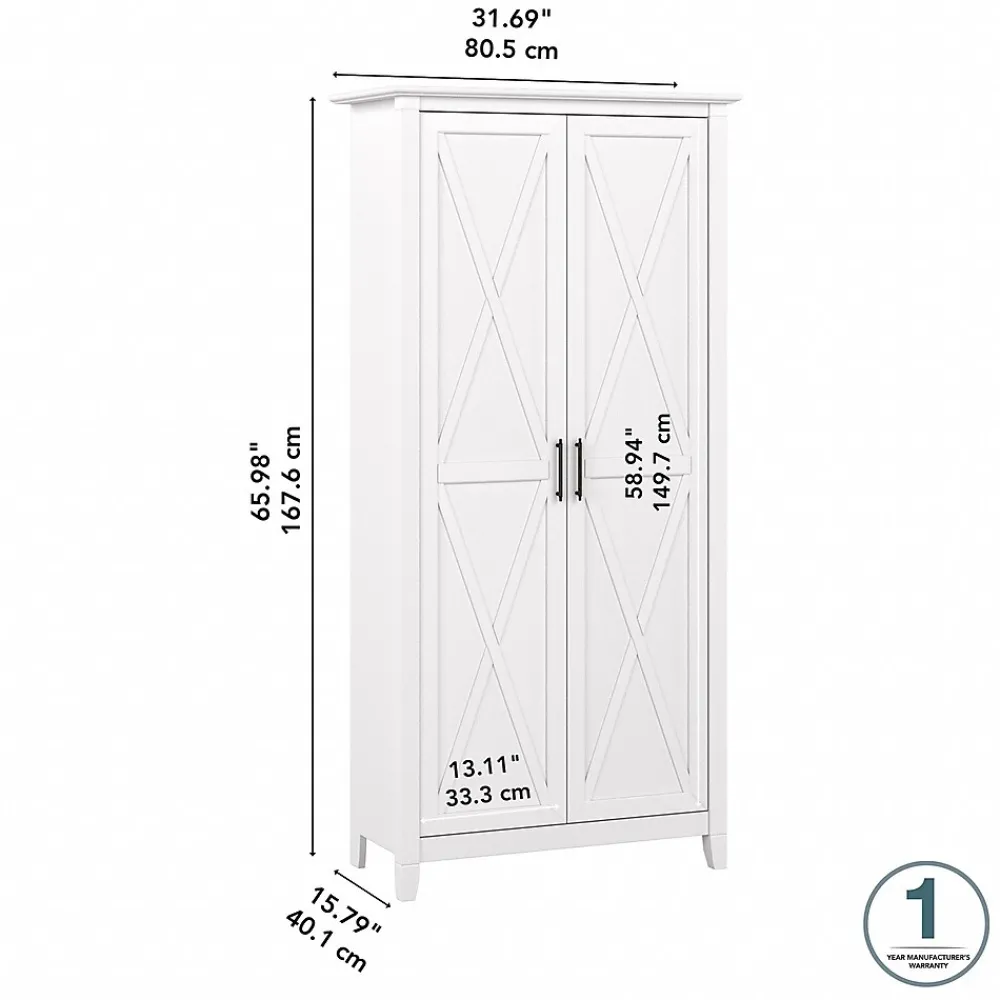 The Bush Furniture Key West tall storage cabinet with doors offers a practical organization solution that gives your home a touch of casual style. This tall accent cabinet features a versatile design that makes it a perfect choice for use in a home office, living room, entryway, or virtually any other residential space. The cabinet contains two fixed shelves and three adjustable shelves to accommodate office supplies and household items of various sizes. Each shelf supports up to 25 lbs., so you’re able to store larger materials with confidence. Cabinet doors open and close on smooth Euro-style hinges for an effortless reach to contents. X-shaped accents convey a casual appearance that works well with cottage, coastal, and modern farmhouse style. This tall cabinet with doors has been tested to meet ANSI/SOHO standards for safety and performance and is backed by 1-year manufacturer limited warranty.