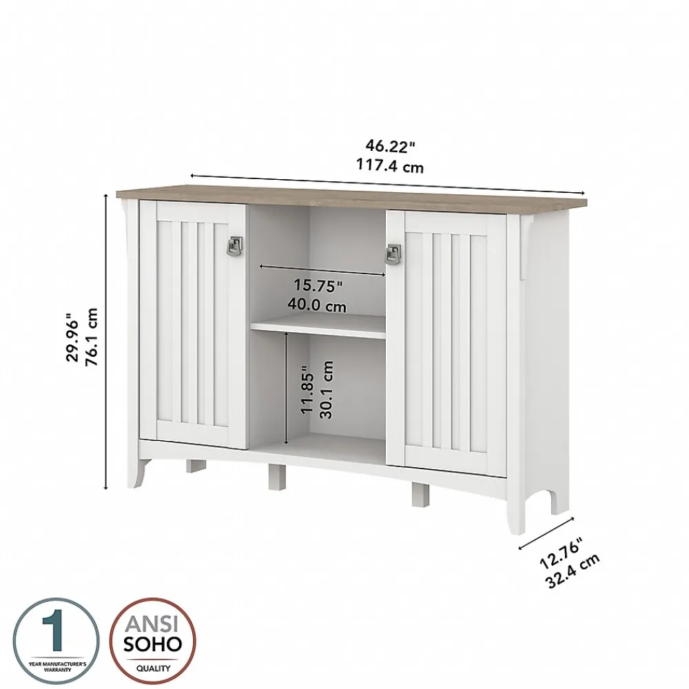 Complement the casual feel of your home with a storage solution designed for your convenience and comfort. The Bush Furniture Salinas accent storage cabinet with doors blends unique details and adjustable features for use in a variety of spaces. Complete your home office, hallway, entryway, or living room with this casual two-door cabinet featuring open and concealed storage. Place your favorite pictures, plants, or a lamp on the spacious top while showing off additional decorations in the open cubby space below. Inspired by timeless Mission style, the doors with vertical wood accents and elegant tumbled pewter hardware conceal any items you don’t want out in the open. This storage cabinet contains two adjustable shelves, one behind each door. The storage cabinet with doors is tested to meet ANSI/SOHO quality standards for safety and performance and is backed by a 1-year manufacturer limited warranty.