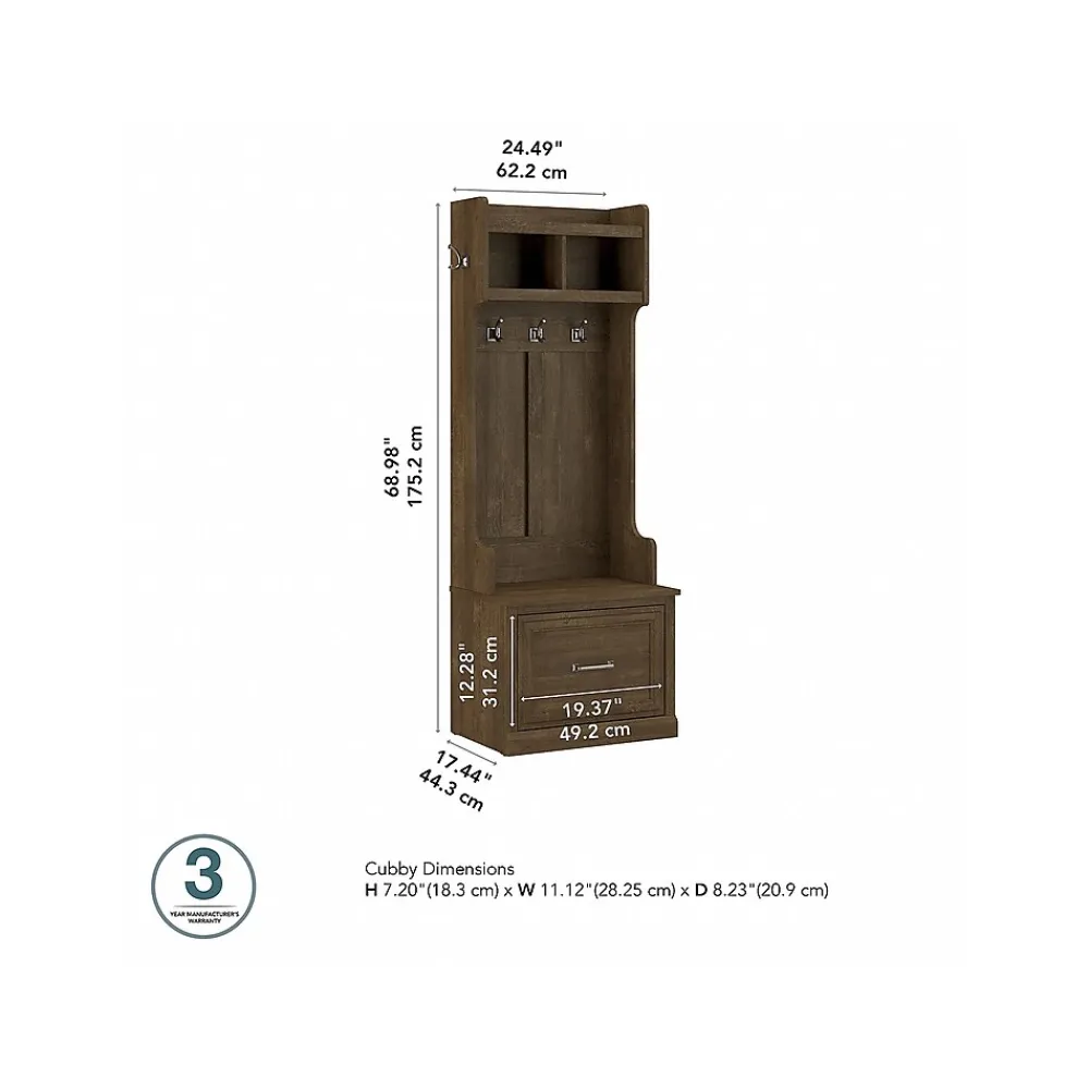 The Bush Furniture Woodland 24W Hall Tree and Small Shoe Bench with Drawer combines transitional styling and a practical design to offer an ideal entryway organizer. Have a seat on the durable bench and take a moment to relax as you get ready to head out the door or come home after a long day. The top of the mudroom bench supports 250 pounds, so you can sit down to put on and take off your shoes or set bags down with confidence. A small drawer opens on smooth ball bearing slides for easy access to footwear and accessories. The narrow Hall Tree features three coat hooks in the front and one on each side for hanging jackets, hats, and more. Smaller items like gloves and keys can be stashed inside two open compartments. This entryway bench with storage has been rigorously tested to meet Bush Furniture’s standards for safety, performance and durability and is backed by a 3 Year Warranty.