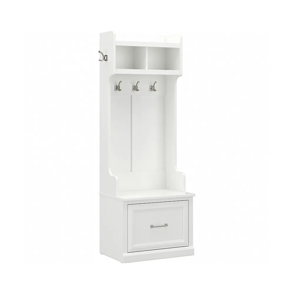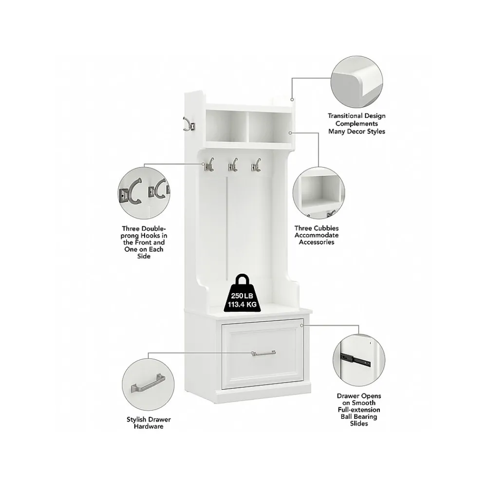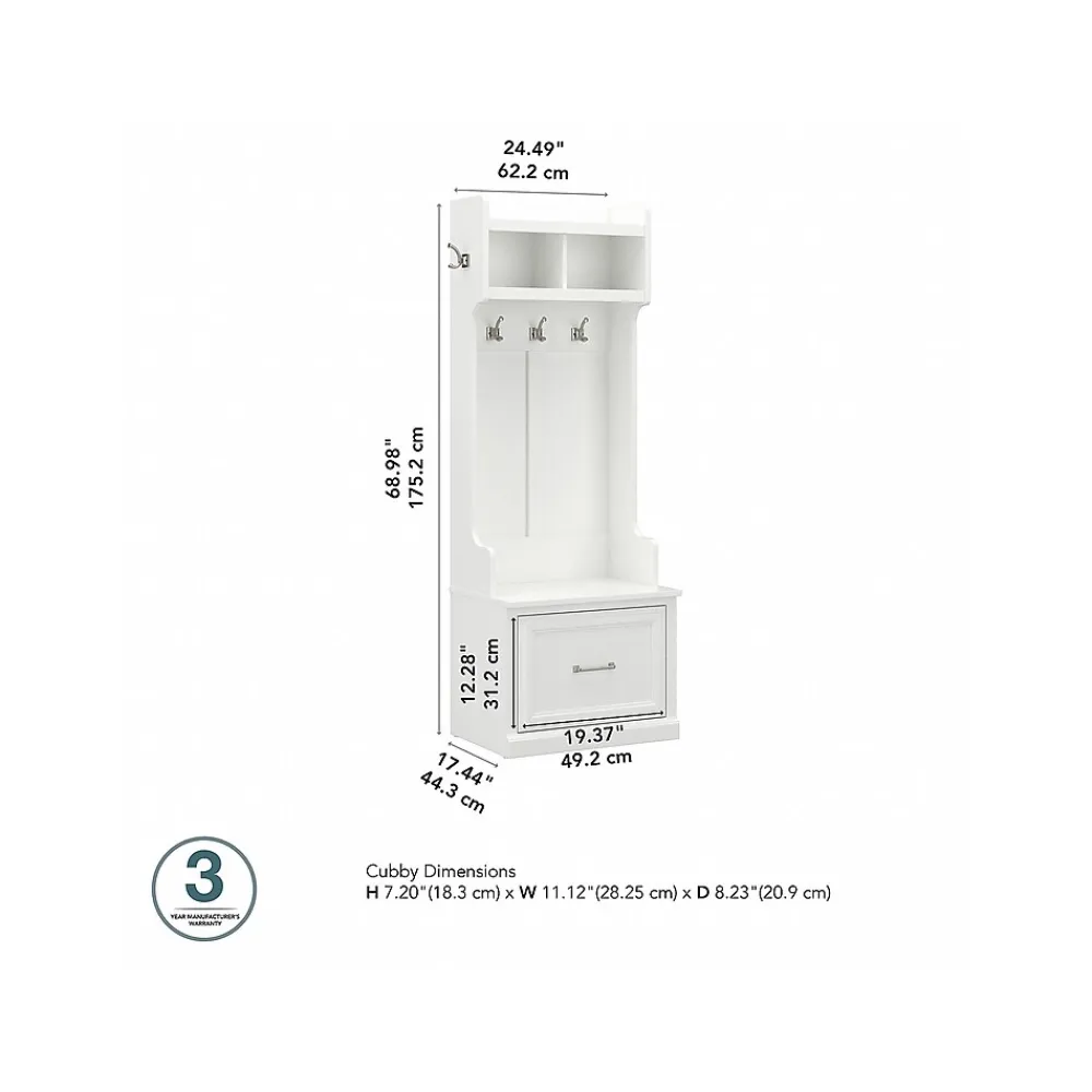The Bush Furniture Woodland 24W Hall Tree and Small Shoe Bench with Drawer combines transitional styling and a practical design to offer an ideal entryway organizer. Have a seat on the durable bench and take a moment to relax as you get ready to head out the door or come home after a long day. The top of the mudroom bench supports 250 pounds, so you can sit down to put on and take off your shoes or set bags down with confidence. A small drawer opens on smooth ball bearing slides for easy access to footwear and accessories. The narrow Hall Tree features three coat hooks in the front and one on each side for hanging jackets, hats, and more. Smaller items like gloves and keys can be stashed inside two open compartments. This entryway bench with storage has been rigorously tested to meet Bush Furniture’s standards for safety, performance and durability and is backed by a 3 Year Warranty.