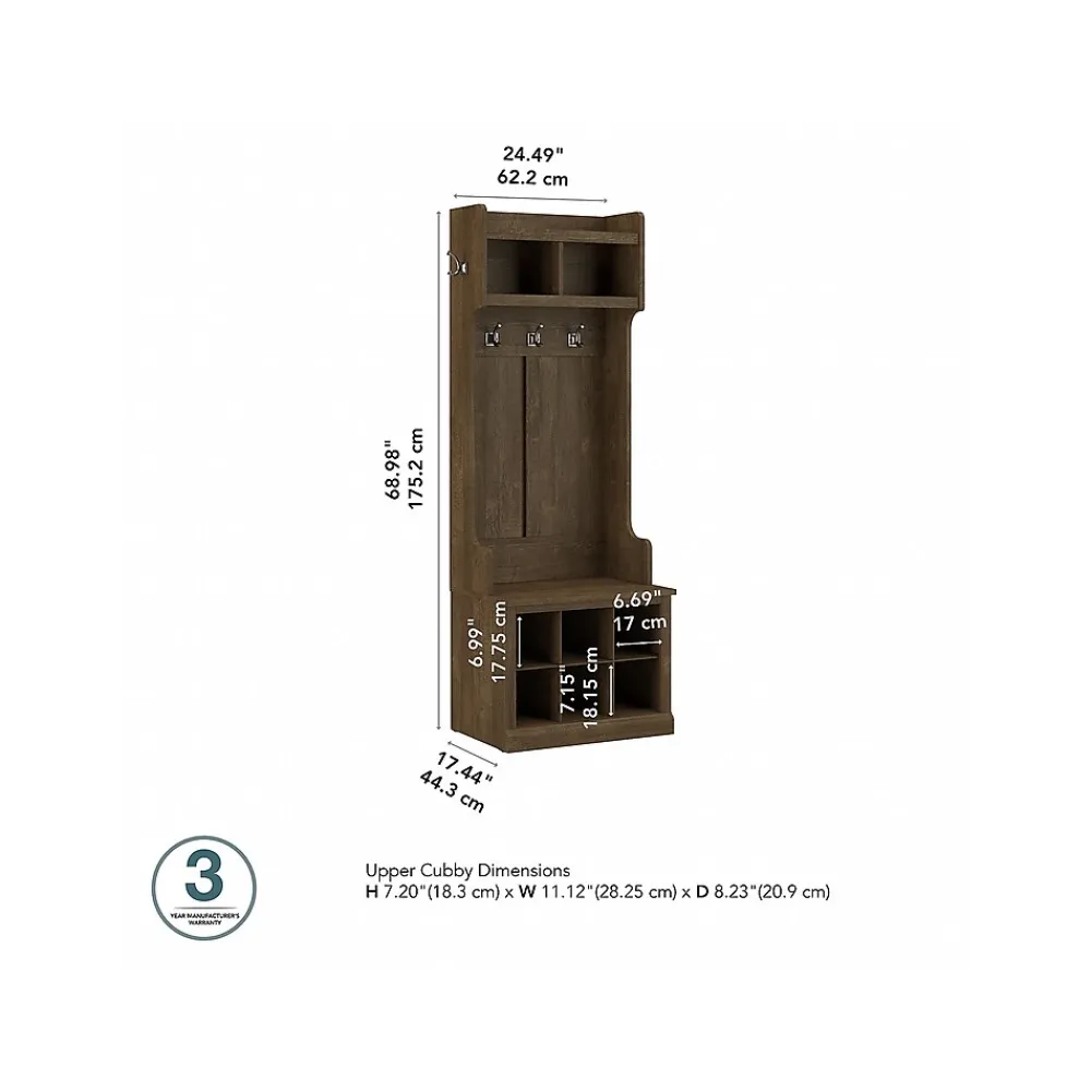 The Bush Furniture Woodland 24W Hall Tree and Small Shoe Bench with Shelves combines transitional styling and a practical design to offer an ideal entryway organizer. Have a seat on the durable bench and take a moment to relax as you get ready to head out the door or come home after a long day. The top of the mudroom bench supports up to 250 pounds, so you can sit down to put on and take off your shoes or set bags down with confidence. Six built-in cubby spaces keep your home organized while providing easy access to footwear. The narrow Hall Tree features three coat hooks in the front and one on each side for hanging jackets, hats, and more. Smaller items like gloves and keys can be stashed inside two open compartments. This entryway bench with storage has been rigorously tested to meet Bush Furniture’s standards for safety, performance and durability and is backed by a 3 Year Warranty.