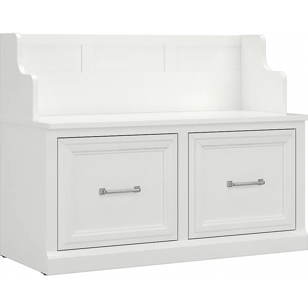 The Bush Furniture Woodland 40W Entryway Bench with Doors combines transitional styling and a practical design to offer an ideal shoe storage solution. Have a seat on the durable shoe bench surface and take a moment to relax as you get ready to head out the door or come home after a long day. The top of the mudroom bench supports up to 250 pounds, so you can sit down to put on and take off your shoes or set shopping bags down after a trip to the store with confidence. Cabinet doors conceal two internal compartments that keep footwear in order and out of sight. The entryway organizer’s transitional design blends elements of contemporary and traditional styling to complement a wide range of home furnishings. This storage bench with back has been rigorously tested to meet Bush Furniture’s standards for safety, performance and durability and is backed by a 3 Year Manufacturer’s Warranty.