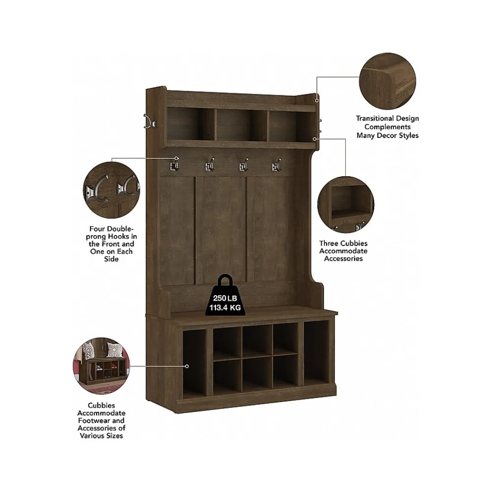 The Bush Furniture Woodland 40W Hall Tree and Shoe Storage Bench with Shelves combines transitional styling and a practical design to offer an ideal entryway organizer. Have a seat on the durable bench and take a moment to relax as you get ready to head out the door or come home after a long day. The top of the mudroom bench supports 250 pounds, so you can sit down to put on and take off shoes or set bags down with confidence. Six cubby spaces and vertical shelves on either side keep footwear of all shapes and sizes in order. The Hall Tree has four coat hooks in the front and one on each side for hanging jackets, hats, scarves and more. Smaller items like gloves and keys can be stashed inside three open compartments. This entryway bench with storage has been rigorously tested to meet Bush Furniture’s standards for safety, performance and durability and is backed by a 3 Year Warranty.