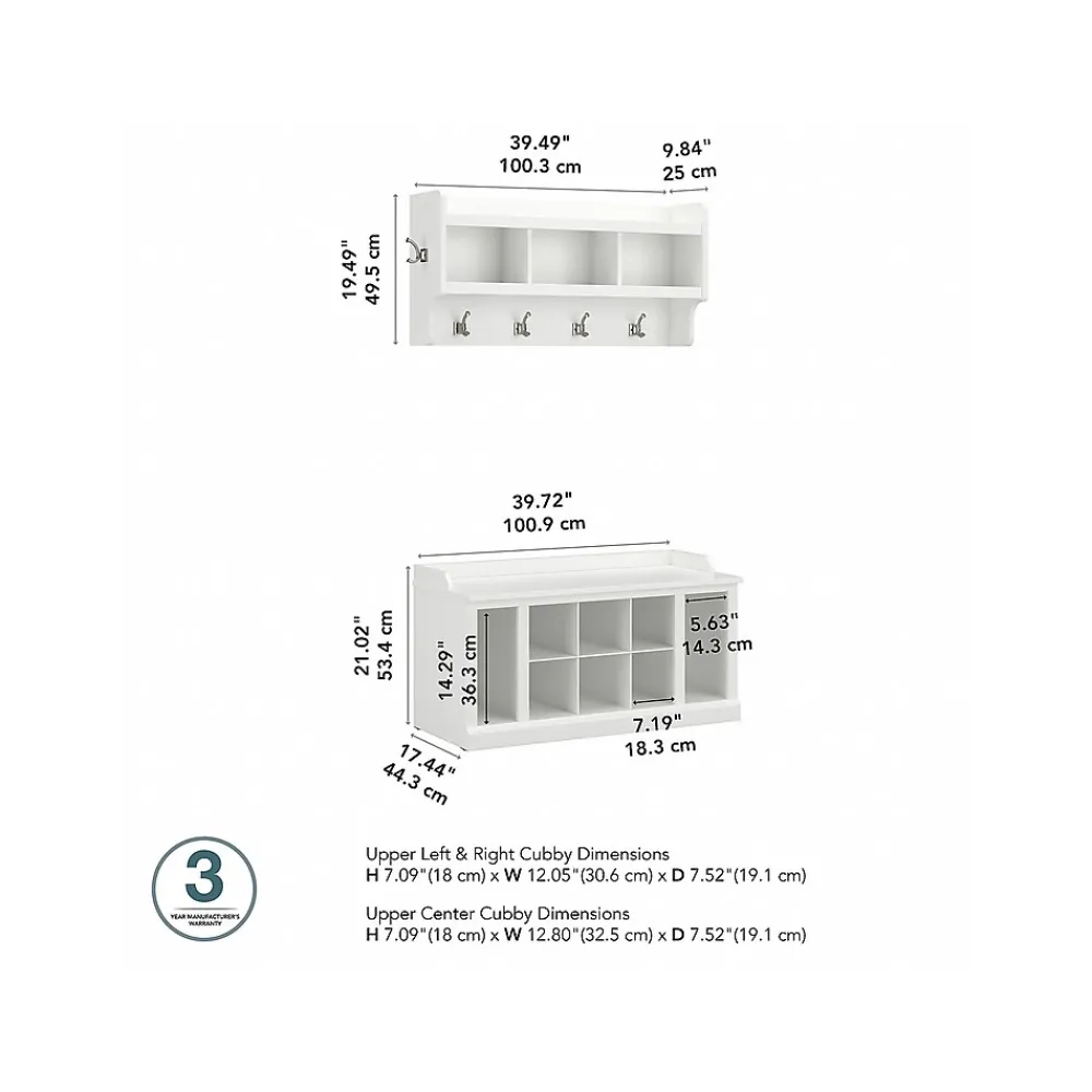 The Bush Furniture Woodland 40W Shoe Storage Bench with Shelves and Wall Mounted Coat Rack combines transitional styling and a practical design to offer an ideal entryway organizer. Have a seat on the durable bench surface and take a moment to relax as you get ready to head out the door or come home after a long day. The top of the mudroom bench supports 250 pounds, so you can sit down to put on and take off your shoes or set shopping bags down with confidence. Six cubby spaces and vertical shelves on either side keep footwear of all shapes and sizes in order. The wall shelf features six coat hooks for hanging jackets, hats, scarves and more. Smaller items like gloves and keys can be stashed neatly inside three open compartments. This entryway bench and coat rack has been tested to meet Bush Furniture’s standards for safety, performance and durability and is backed by a 3 Year Warranty.