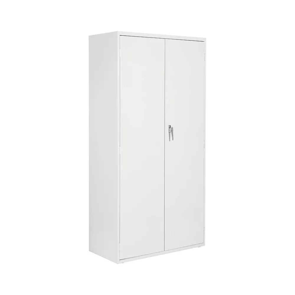 Organize paper, pens, and other office supplies in this Global 9300 Series designer white vertical steel storage cabinet. Secure office supplies and equipment in this steel storage cabinet. It is lockable, so you can monitor access to expensive equipment, and the corners are welded, providing durability. The electrostatically applied coating creates a durable, attractive finish, and the cabinet is 72″ tall to save floor space. This Global 9300 Series storage cabinet has doors that open 170 degrees for easy placement of large items. This large storage cabinet is an optimal solution when you need extra capacity to store more stuff and heavy loads.