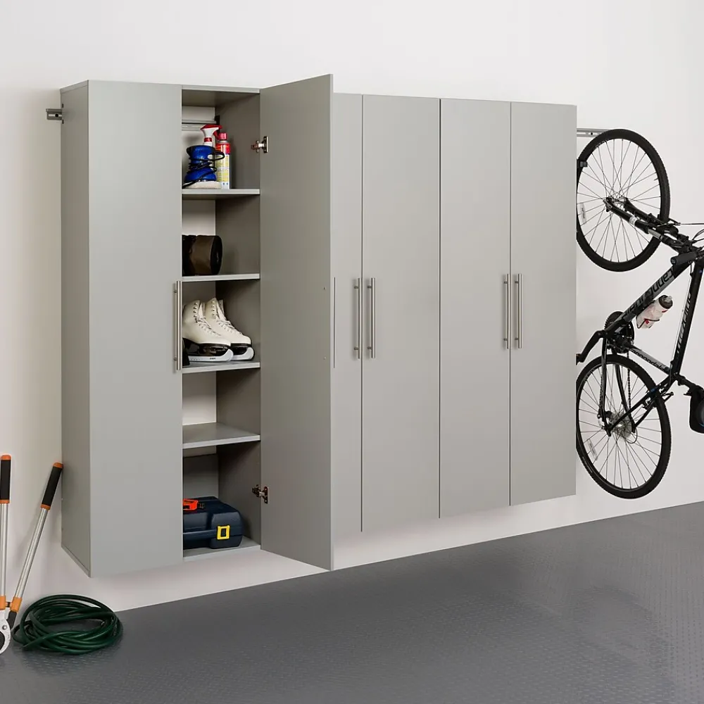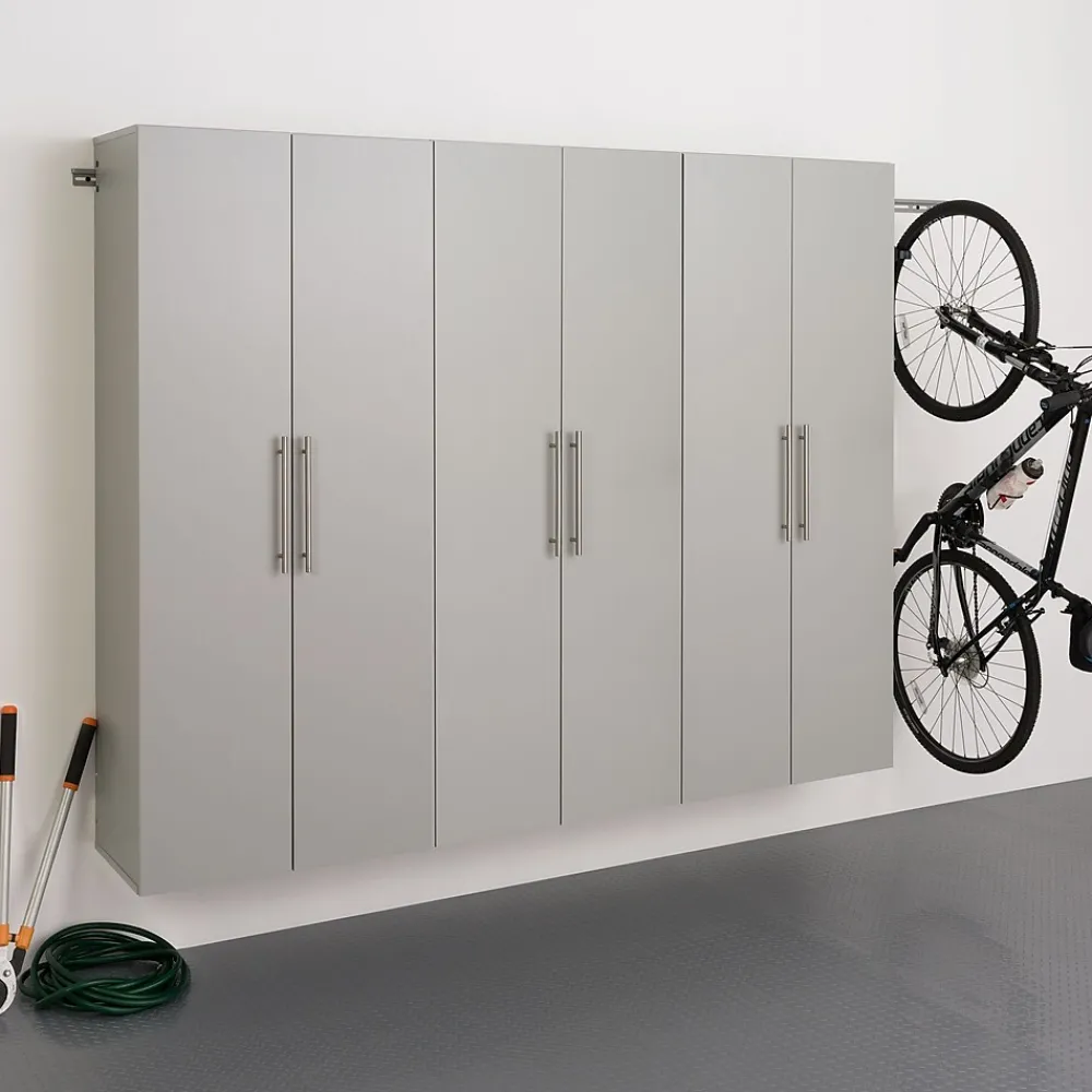The HangUps Storage Cabinet Collection offers versatility for your ever changing storage needs in the garage, laundry room, office or workshop. The Cabinets mount securely to the wall with a heavy duty metal rail and hook system. The wall mounted feature ensures easy cleaning beneath the cabinets and protects your stored items from water & dirt. The HangUps Collection is constructed using laminated composite wood and features metal handles and adjustable hinges. This product ships ready-to-assemble and includes all hanging rails and fastening bolts. Add other cabinets from our HangUps Collection to create a storage system to convert any cluttered room into an organized space. Set D Includes: (Qty 3) 30” Large Storage Cabinet Model # GSCW-0707-2K 30″W x 72″H x 16″D 3 adjustable shelves and 1 fixed shelf with middle divider (shelves are .75″ thick)Weight Capacity: 200lbs (40lbs per shelf)