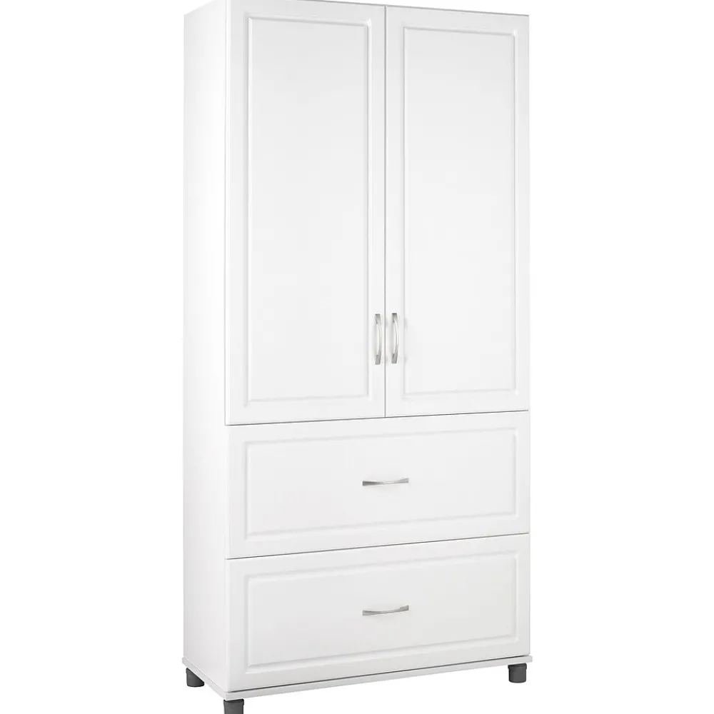 Satisfy all your storage needs with the SystemBuild Kendall 36” 2 Drawer/2 Door Storage Cabinet. Whether you need a place to store kitchen bowls and appliance or somewhere to place extra towels and bed sheets, this Cabinet is the perfect choice. Behind the doors, 3 shelves offer plenty of room for items that need a home. Two of the shelves are adjustable to meet your specific storage needs. The 2 roomy drawers provide additional easy-access storage space. The 36” 2 Drawer/2 Door Storage Cabinet features a crisp white finish that creates a refined, clean look in your home. Use this piece as a stand-alone item, or combine it with additional SystemBuild Kendall storage items to create the perfect storage solution for your home. SystemBuild 36” 2 Drawer/2 Door Storage Cabinet requires assembly upon delivery.