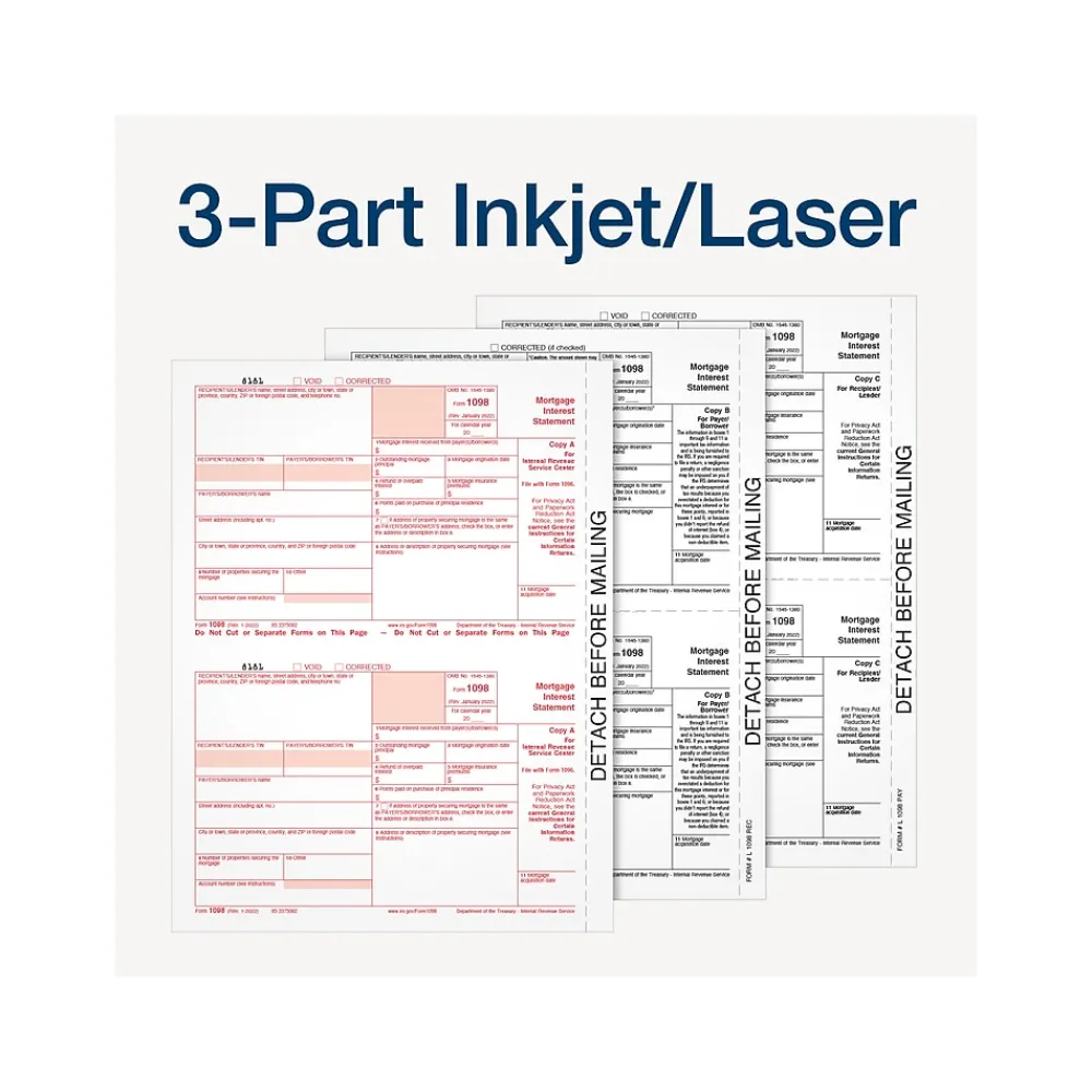 - 3-Part 1098 forms print 2 to a page on 6 micro-perforated sheets with copies A, B & C