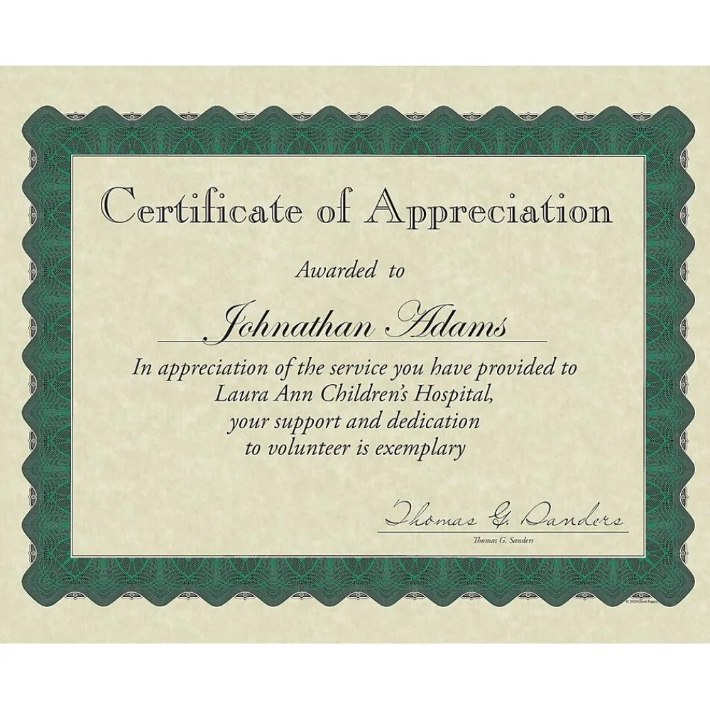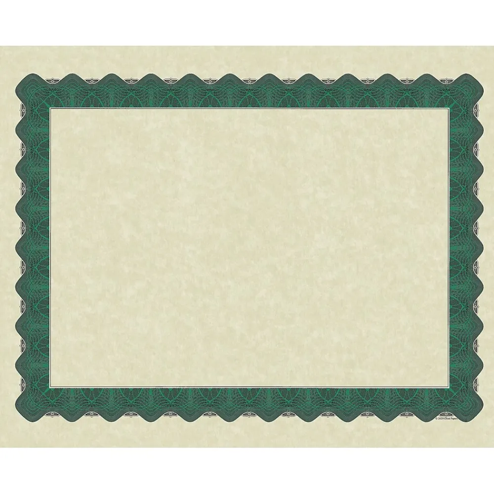Create professional documents for graduation ceremonies, awards, and contest winners by printing custom designs on these parchment-patterned certificates. The delicate metallic green border on each of these certificates adds a special touch to the 60-pound paper stock, calling attention to recognized achievements. This pack contains 100 blank Great Papers Masterpiece Studios parchment certificates, which are compatible with both inkjet and laser printers.