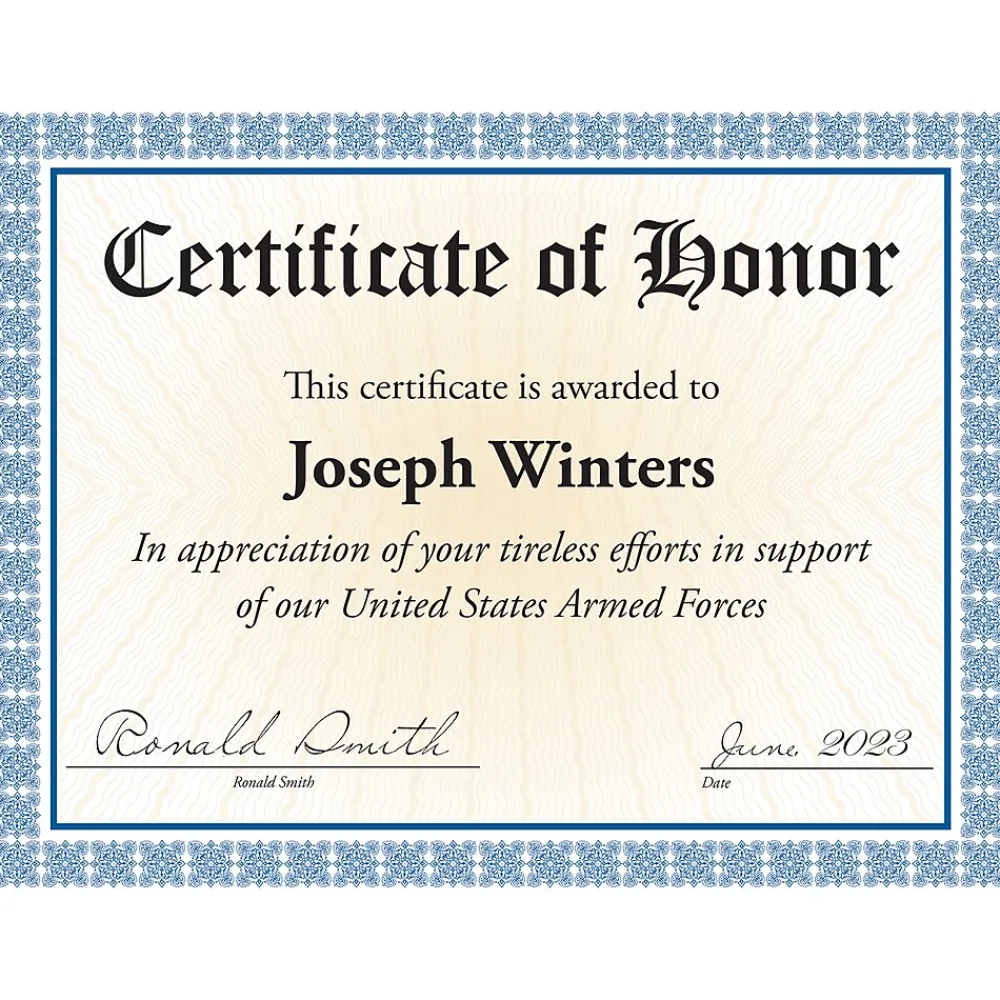 Great Papers® Westminster blue parchment certificate is acid and lignin free. Certificate measures 8.5″ x 11″ and is compatible with laser, inkjet printers.