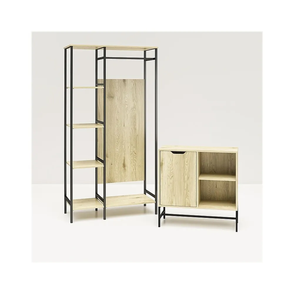 - Two open shelves (one fixed, one adjustable) and one closed cabinet shelf for books and other essentials