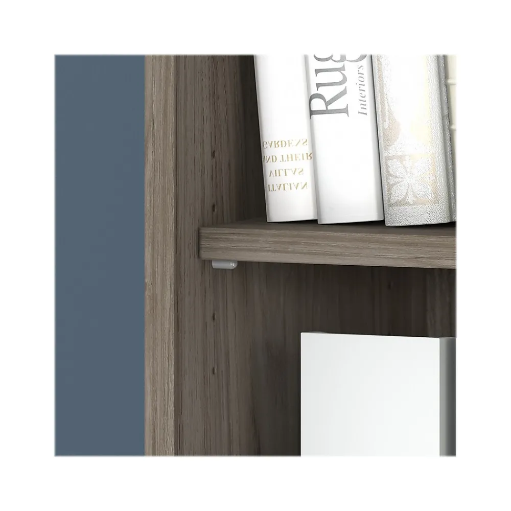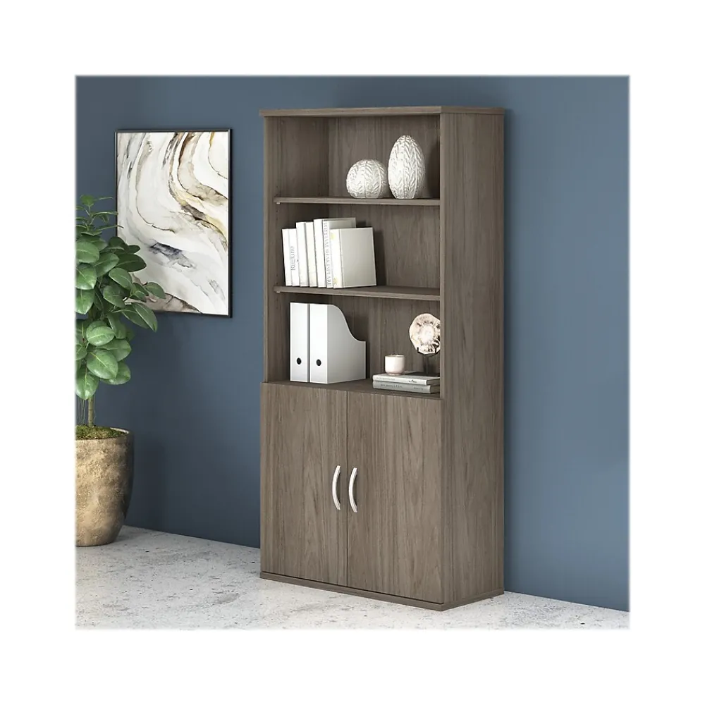 The Bush Business Furniture Studio C five-shelf bookcase with doors looks great, works hard, and adjusts to fit the needs of your office. Designed with two fixed and three adjustable shelves, the bookcase holds your books and reference materials with plenty of room for your favorite decorative accents. Confidently store a variety of items on the spacious and durable shelves, designed to hold up to 50 lbs. each. A thermally fused laminate finish fends off everyday damage such as scratches and stains throughout years of everyday use. Two doors with smooth Euro-style hinges conceal your office supplies and add an eye-catching touch to your workspace. This tall bookcase with doors comes with a 10-year warranty and meets ANSI/BIFMA quality test standards. See the full collection for coordinating items available to make your office your own with Bush Business Furniture Studio C. American-made with US and imported parts.