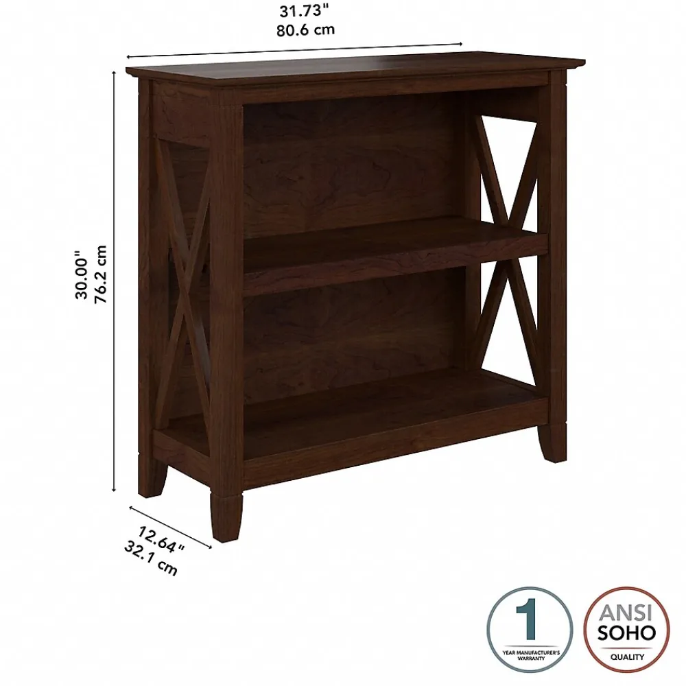 The Bush Furniture Key West small two-shelf bookcase offers a practical storage and display solution that gives your home a touch of casual style. This small bookshelf features a compact, versatile design that makes it a perfect choice for use in a home office, living room, entryway, or virtually any other residential space. One fixed shelf and one adjustable shelf accommodate books, reference materials, and decorations of various sizes. Each shelf supports up to 35 lbs., so you can store and display larger items with confidence. A post leg design and X-pattern accents convey a casual appearance that works well with cottage, coastal, and modern farmhouse style. This small bookcase has been tested to meet ANSI/SOHO quality standards for safety and performance and is backed by the Bush Furniture 1-year manufacturer warranty. See the full collection for coordinating items available.