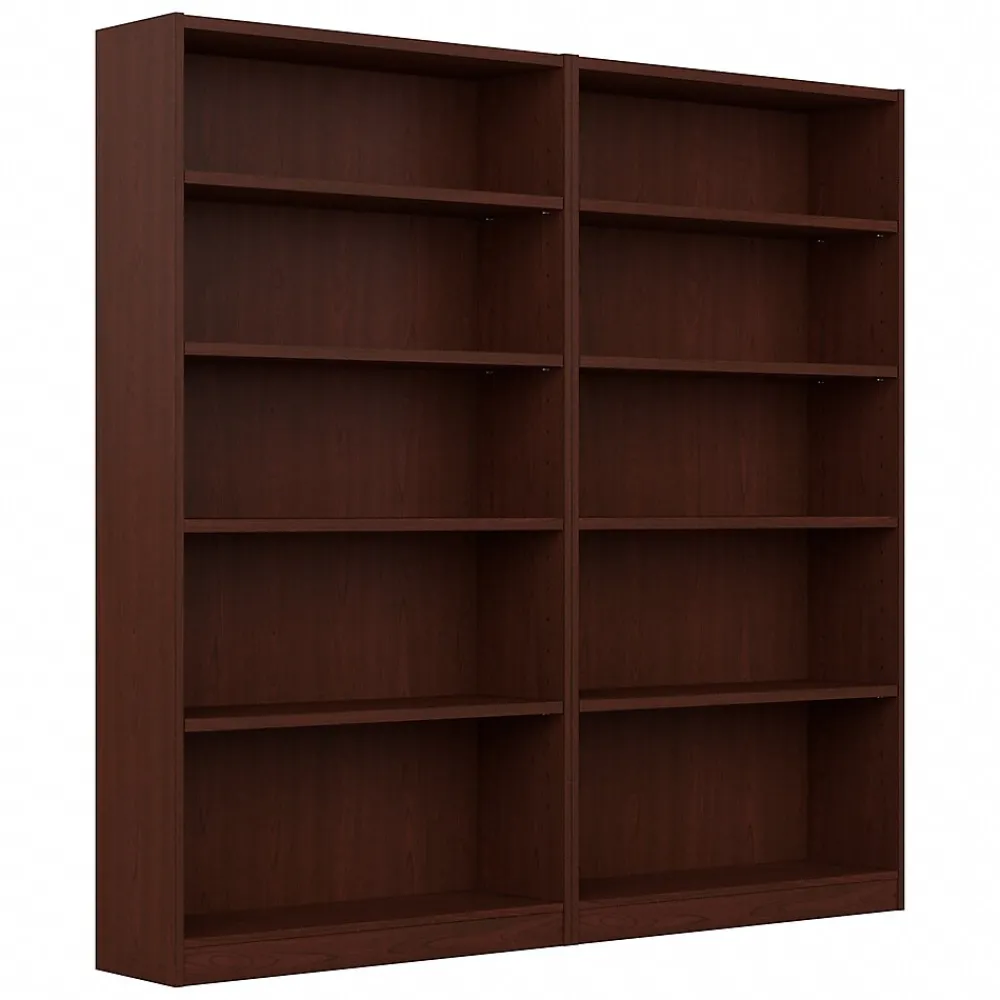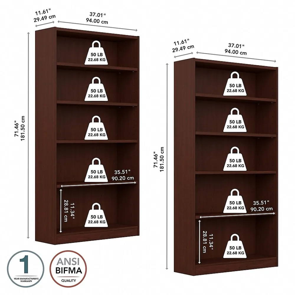 The Bush Furniture Universal Tall 5 Shelf Bookcase – Set of 2 provides a versatile organization solution that allows you to show off your personal library or brighten up the room with pictures and decorations. Each Bookcase has three adjustable shelves that move up and down to accommodate larger items like binders and photo albums while two fixed shelves offer added stability. The sturdy one-inch thick shelves prevent sagging and have a weight capacity of 50 pounds each, so storing magazines, hardcover books, or vinyl records is never a problem. Tip Guard(TM) safety features include a stable design and wall attachment hardware for family-friendly safety in any space. The bookcases have been tested with a 50 pound hanging weight to create a safe environment in any space. This tall bookshelf set meets ANSI/BIFMA standards for safety and performance and is backed by a 1 Year Warranty.