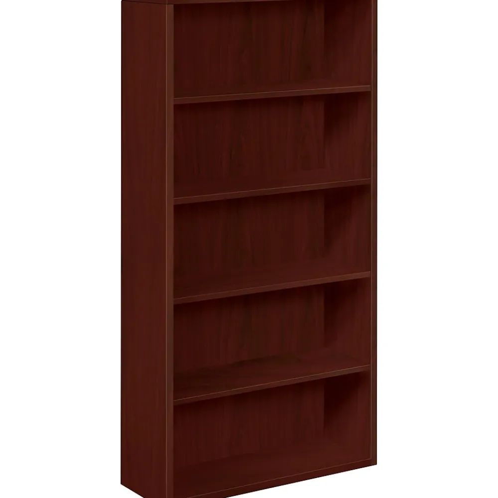 This five-shelf bookcase is factory-assembled and amazingly strong, ready to handle your books and reference materials. Laminate finish color is Mahogany.
