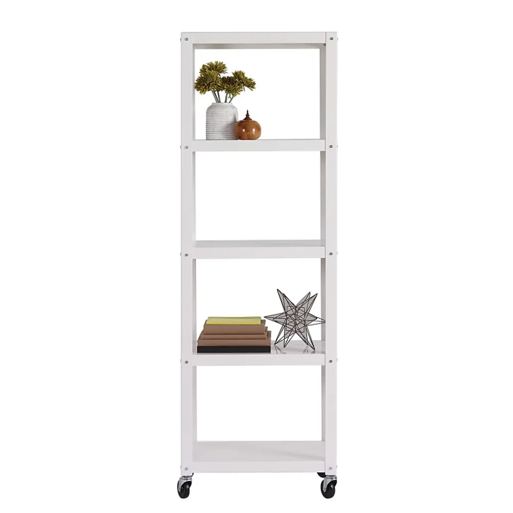 The Five Shelf Tower is great in any room. This steel construction heavy-duty shelving unit is durable enough for most uses and sports a modern design.It is an excellent storage solution for craft rooms, offices, kitchen, pantries, or more. Sized at 72″ x 24″ x 14″, this attractive and strong shelving unit gives you flexibility for whatever your storage and organization needs are. Whether you need a shelf for your printer, books, craft supplies, or additional kitchen storage, this 5-shelf tower is the answer. The additional wheels also allow this shelving unit to be easily moved as needed. Assembly is required.