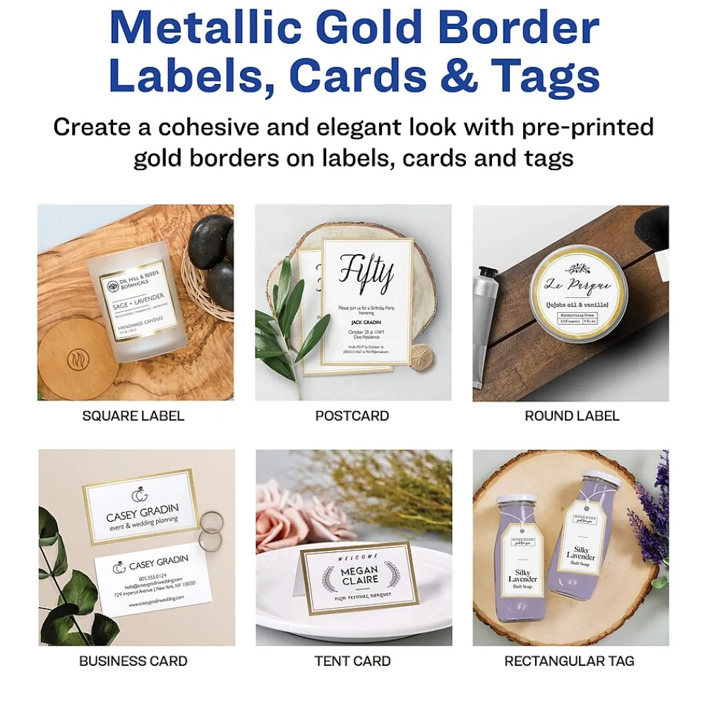 - Create an elegant look with white business cards featuring eye-catching metallic gold borders that pair beautifully with other Avery metallic gold border products
