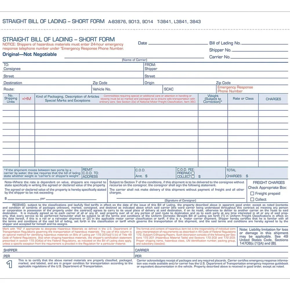 Adams® Carbonless bill of lading form measures 8 1/2″ x 7 1/2″. Short carbonless form is sold as 50 sets per pack.